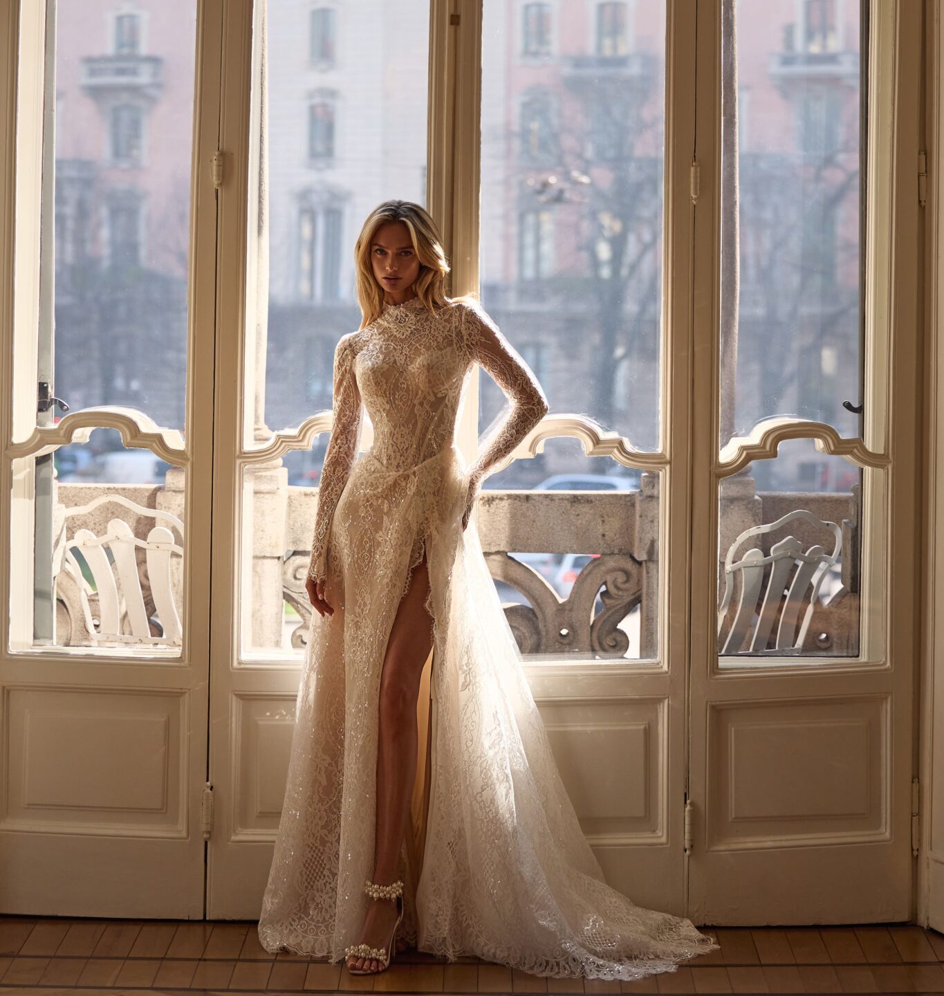 Traumhafte schmale A-Line von Milla Nova - NOVALISSE - aus zarter Glitzer-Spitze und Beinschlitz. Hochgeschlossen und mit langen Ärmeln.