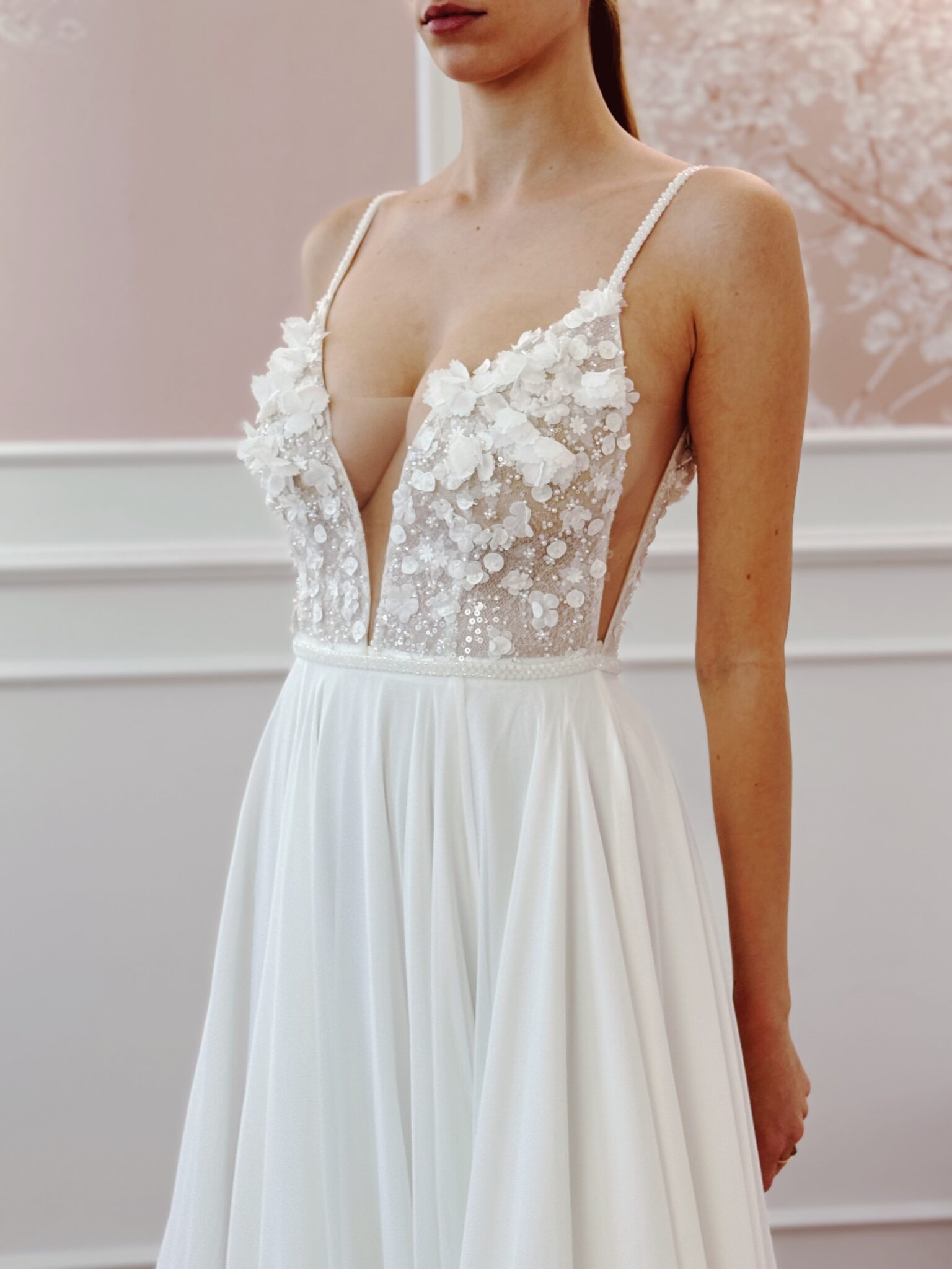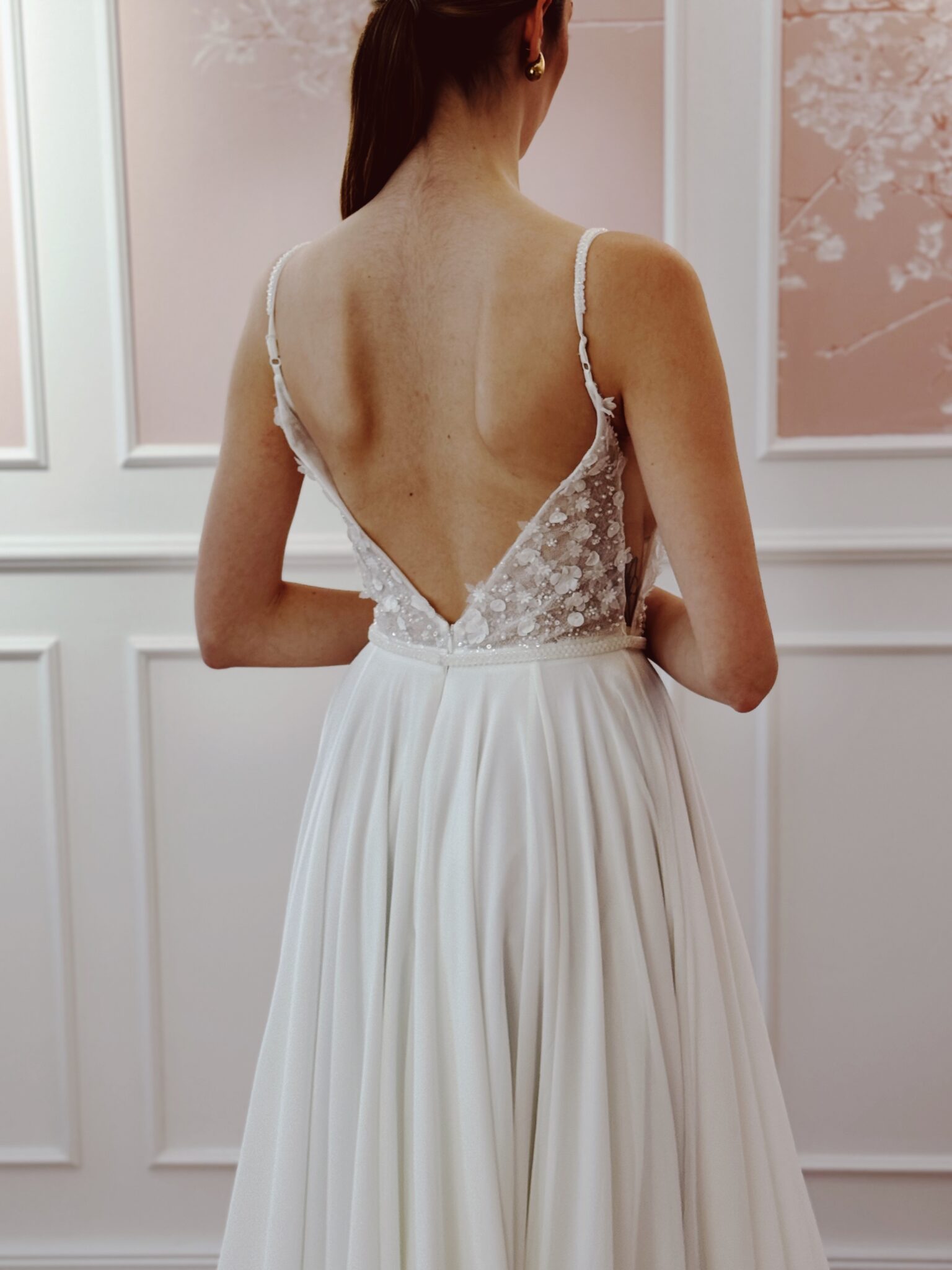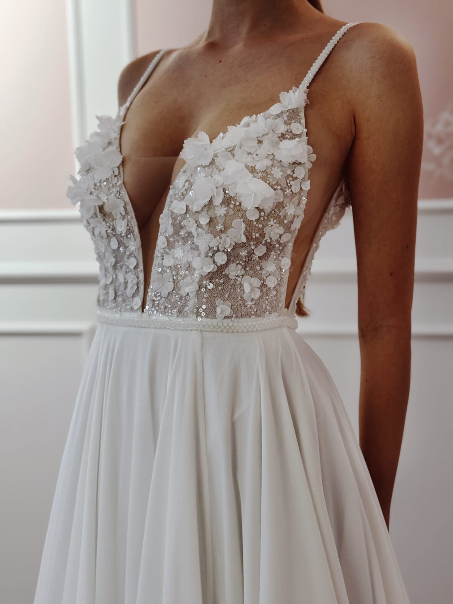 Designer Chiffon A-Linie von Milla Nova - SAMARA mit Cut Outs im Dekolleté und an den Seiten, tiefem Rückenausschnitt, einer Corsage mit 3D-Spitzenapplikationen und Perlen. Das Kleid in Gr. 38 passte. Unser Model ist 1,78 m, trägt Gr. 36/38 und hat Körbchengröße: 75E mit den Maßen: B: 89cm, T: 66cm, H:97cm.