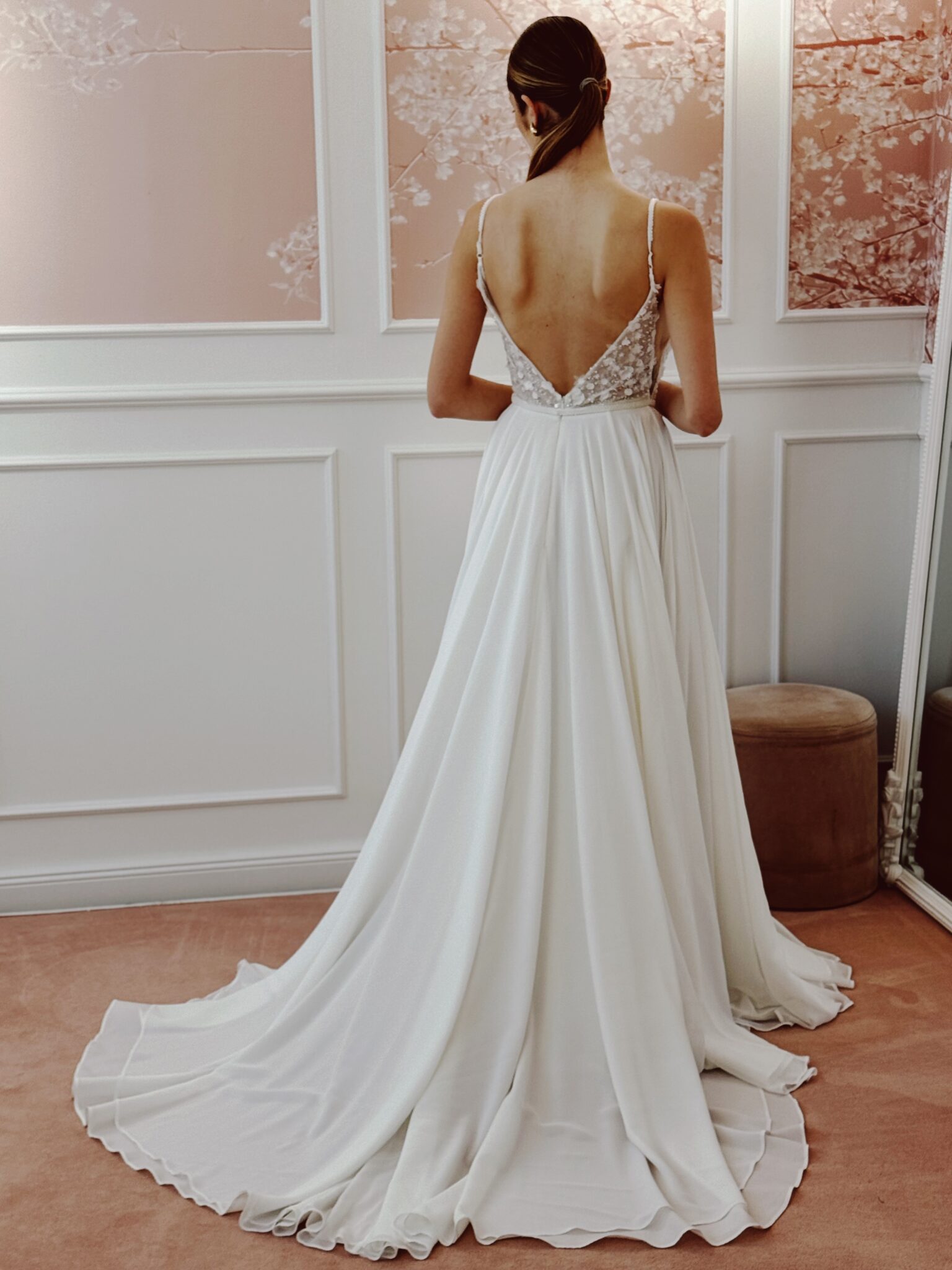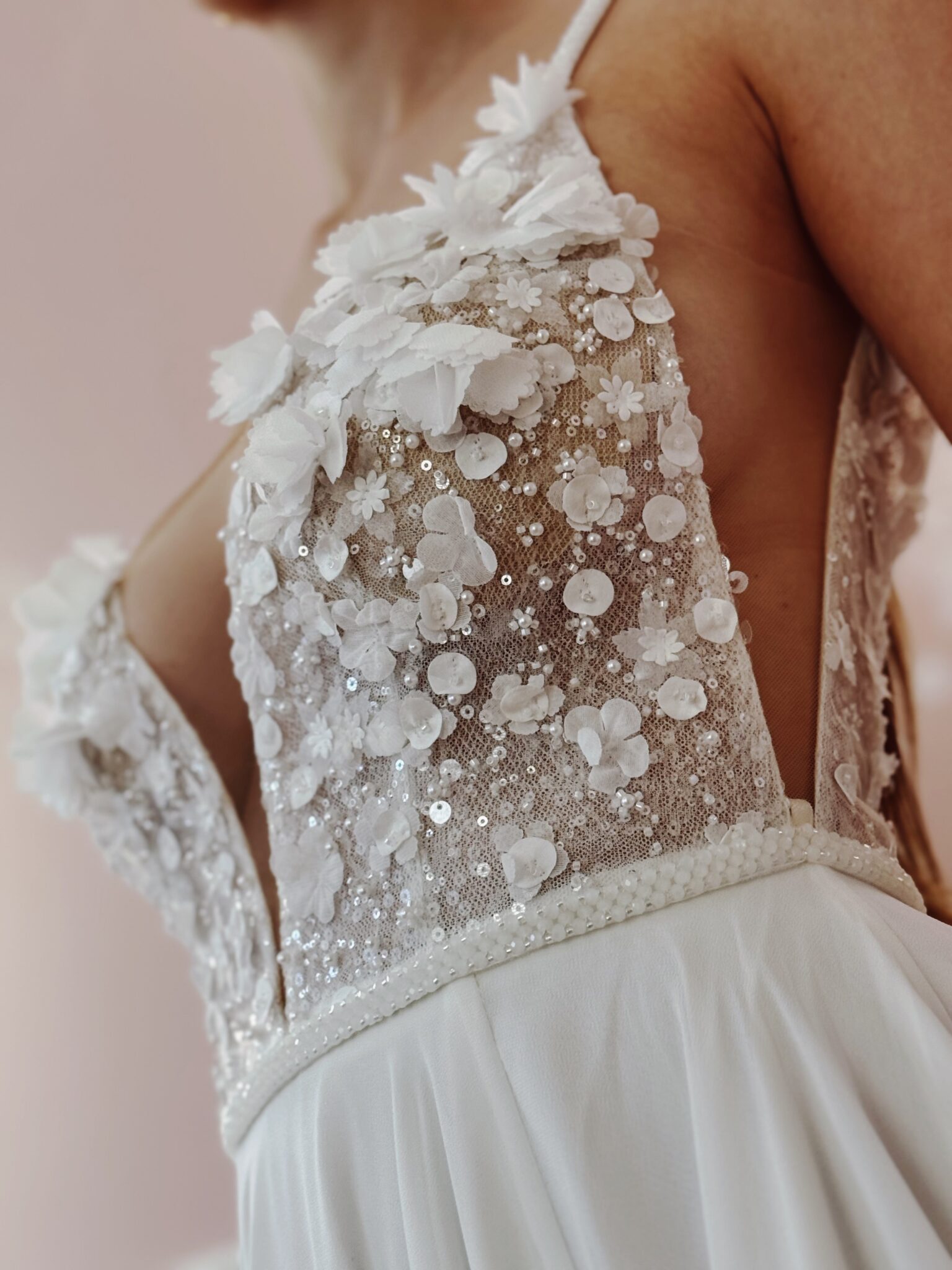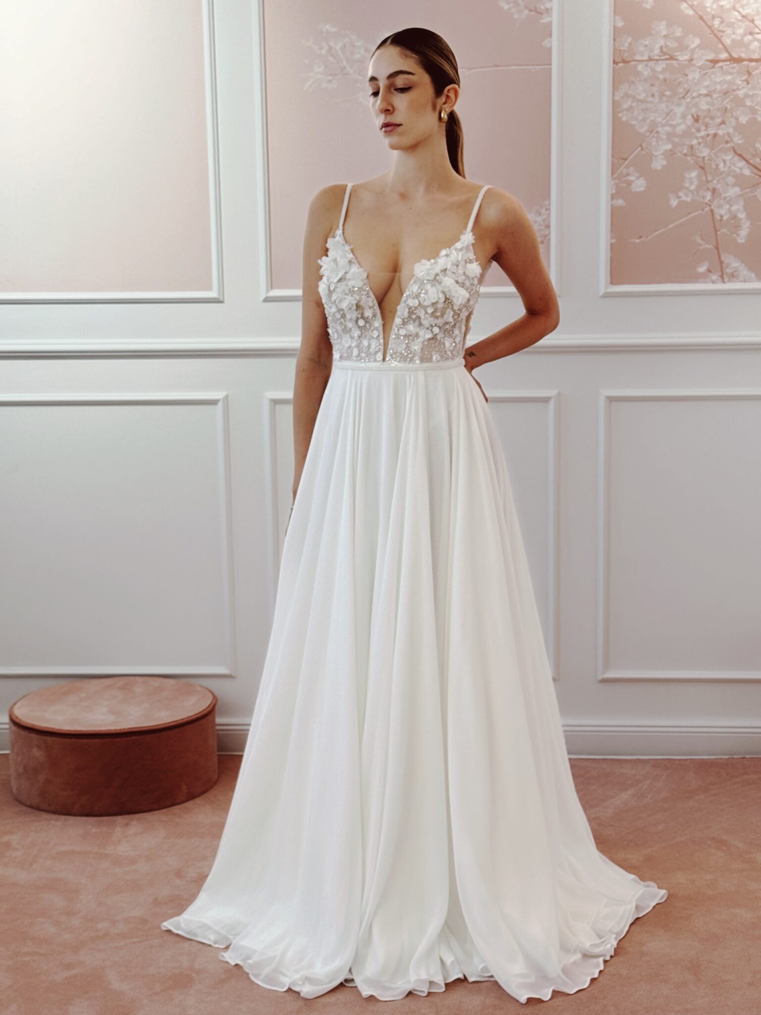Designer Chiffon A-Linie von Milla Nova - SAMARA mit Cut Outs im Dekolleté und an den Seiten, tiefem Rückenausschnitt, einer Corsage mit 3D-Spitzenapplikationen und Perlen. Das Kleid in Gr. 38 passte. Unser Model ist 1,78 m, trägt Gr. 36/38 und hat Körbchengröße: 75E mit den Maßen: B: 89cm, T: 66cm, H:97cm.