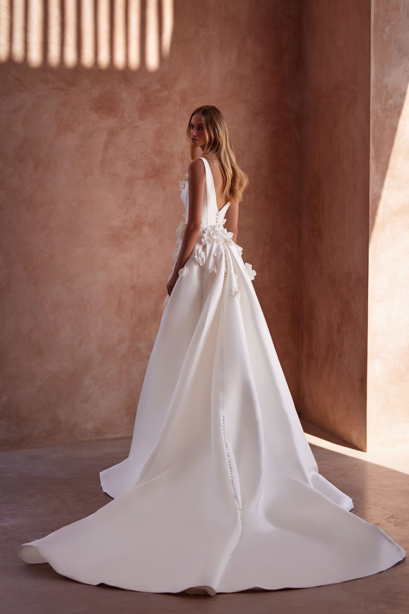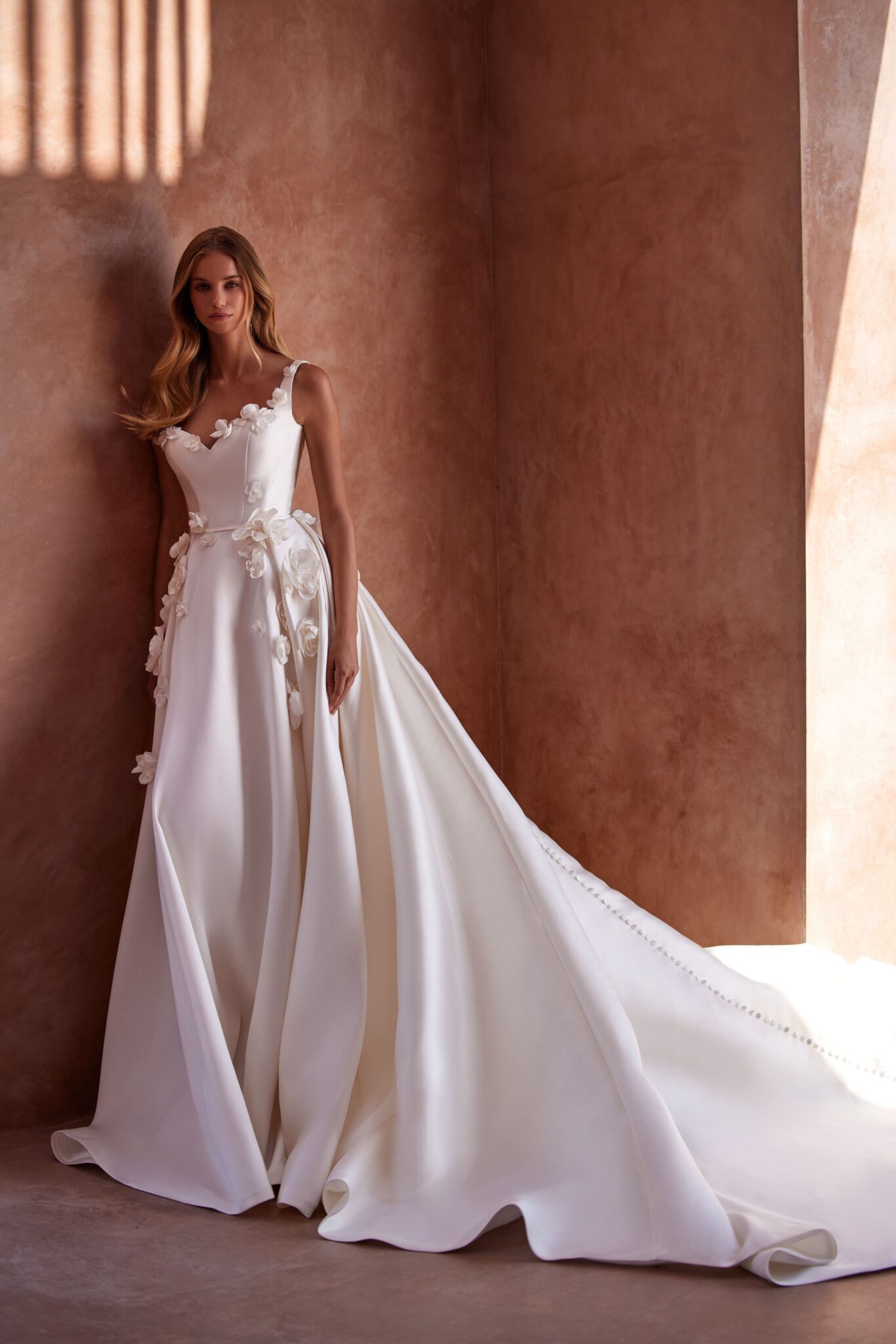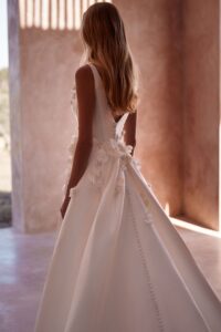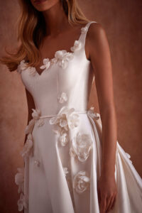 A-Linie Kleid aus Mikado-Satin: Milla Nova - SHOSHANA mit 3D-Blüten in der Korsage und im Rock. Das Kleid in Gr. 38 war ein wenig groß: Unser Model ist 1,78 m, trägt Gr. 36/38 und hat Körbchengröße: 75E mit den Maßen: B: 89cm, T: 66cm, H:97cm.