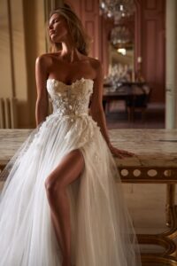 A-Linie Kleid aus Tüll: Milla Nova - SINATRA mit 3D-Blüten, Lingerie-Effekt, Glitzerspitzenapplikationen und Chantilly-Lace in der 2. Tüll-Lage & Beinschlitz. Das Kleid in Gr. 36 saß gut, die Korsage hält auch eine große Oberweite: Unser Model ist 1,78 m, trägt Gr. 36/38 und hat Körbchengröße: 75E mit den Maßen: B: 89cm, T: 66cm, H:97cm.