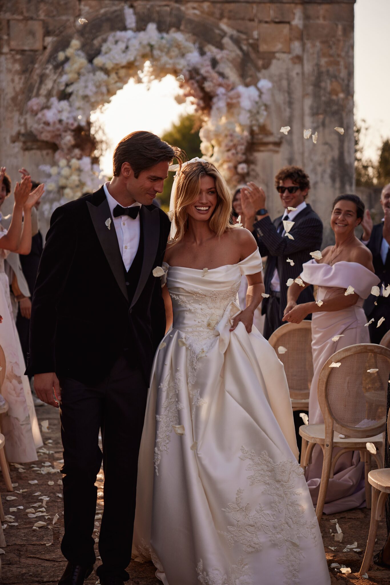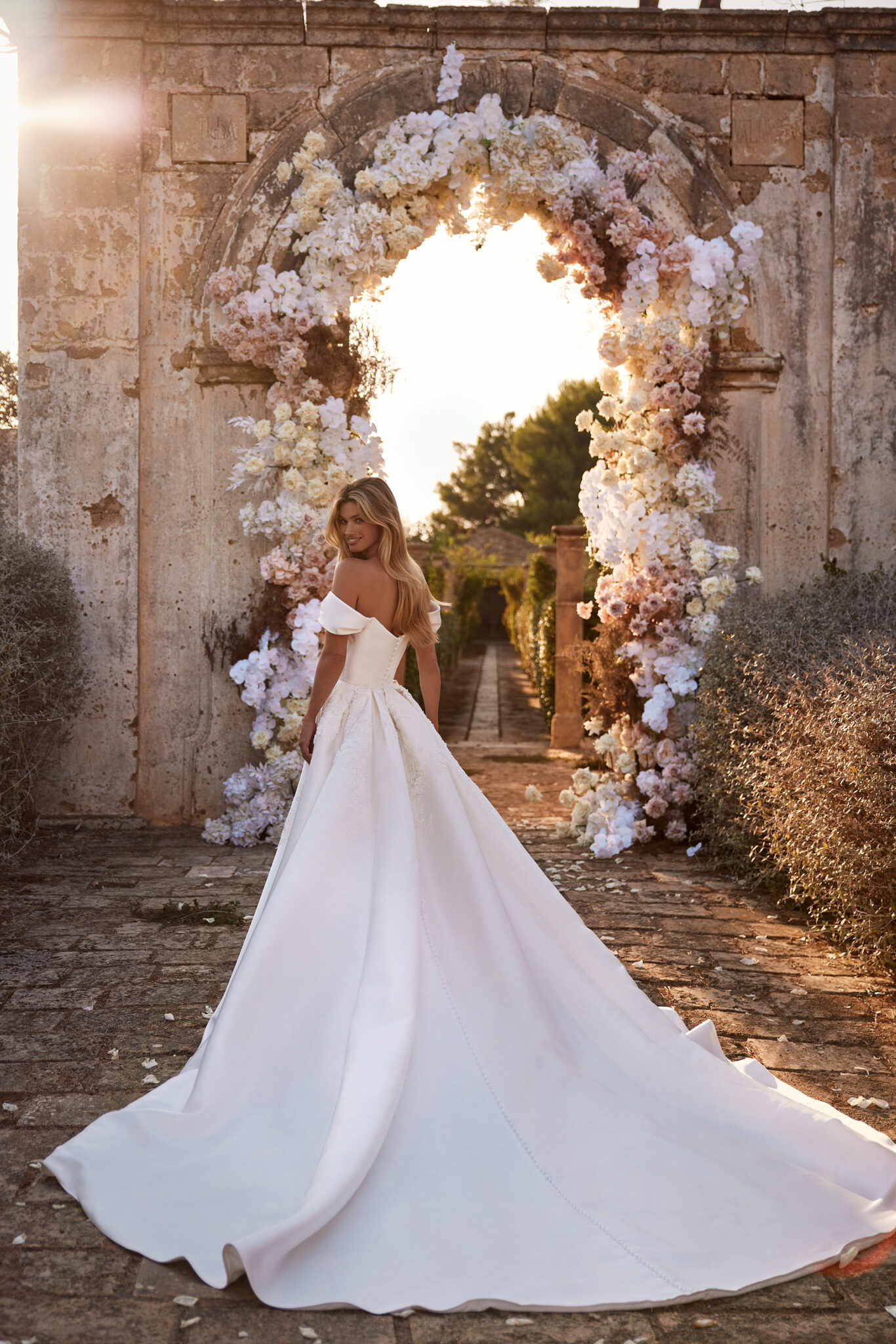 Designer A-Linie von Milla Nova - SYMPHONY mit schulterfreiem, drapiertem Ausschnitt, einem cleanen Design und zarten floralen Stickereien, die durch feine Perlendetails ergänzt werden. Das Kleid in Gr. 38 passte. Unser Model ist 1,78 m, trägt Gr. 36/38 und hat Körbchengröße: 75E mit den Maßen: B: 89cm, T: 66cm, H:97cm.