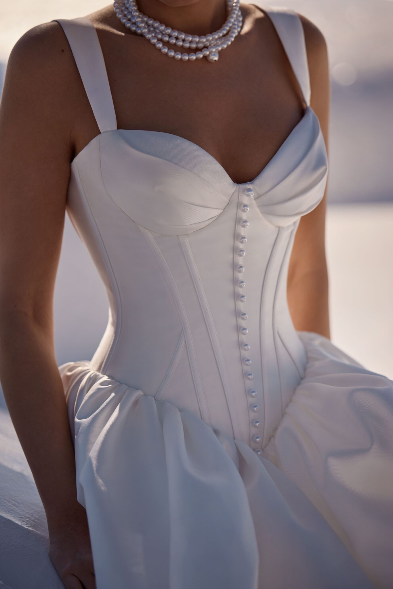 A-Linie von Milla Nova - WHISPER mit herzförmigem Dekolleté, muschelförmig gearbeiteten Cups und einem tief angesetzten Korsagen-Oberteil mit sichtbaren Stäbchen sowie einem voluminösen Rock. Das Kleid in Gr. 36 passte gut. Unser Model ist 1,78 m, trägt Gr. 36/38 und hat Körbchengröße: 75E mit den Maßen: B: 89cm, T: 66cm, H:97cm.