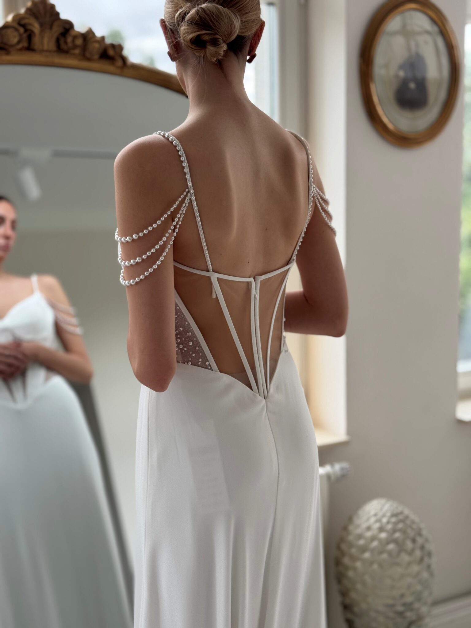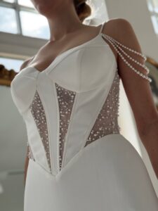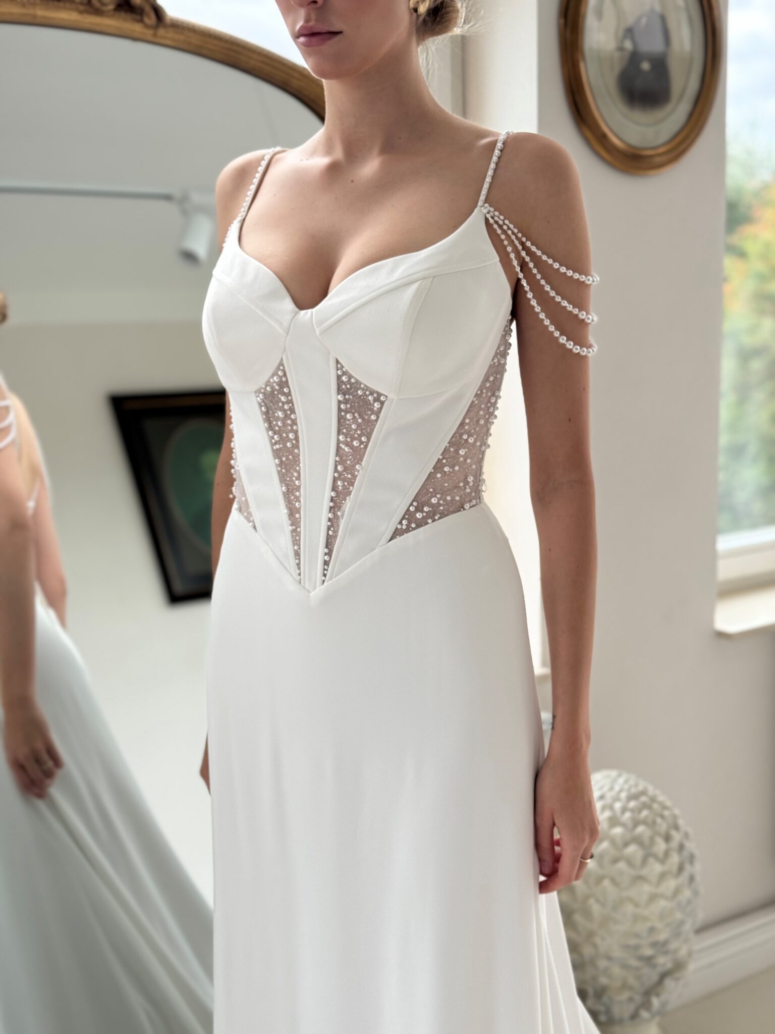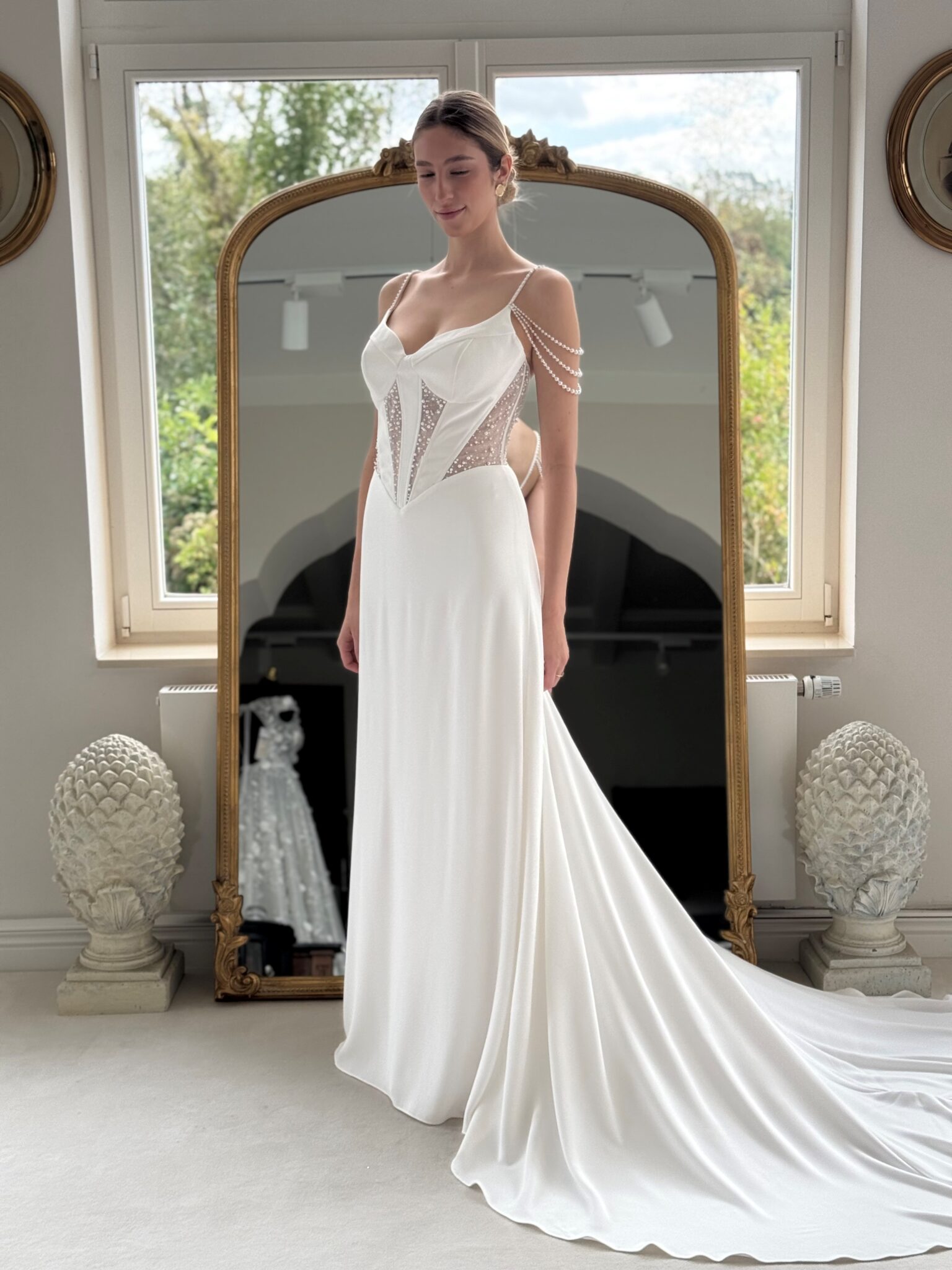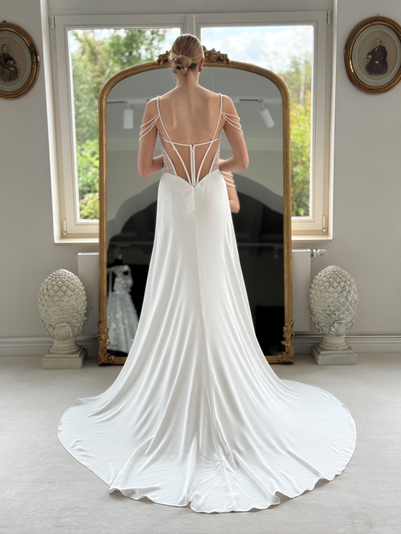 Designer Fit & flare von Modeca - ISOLDE mit Perlen bestickten Cut Outs in der Korsage, Perlenträgern und einem transparenten Rücken. Das Kleid in Gr. 38 war ein wenig zu groß. Unser Model ist 1,78 m, trägt Gr. 36/38 und hat Körbchengröße: 75E mit den Maßen: B: 89cm, T: 66cm, H:97cm.