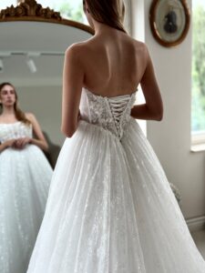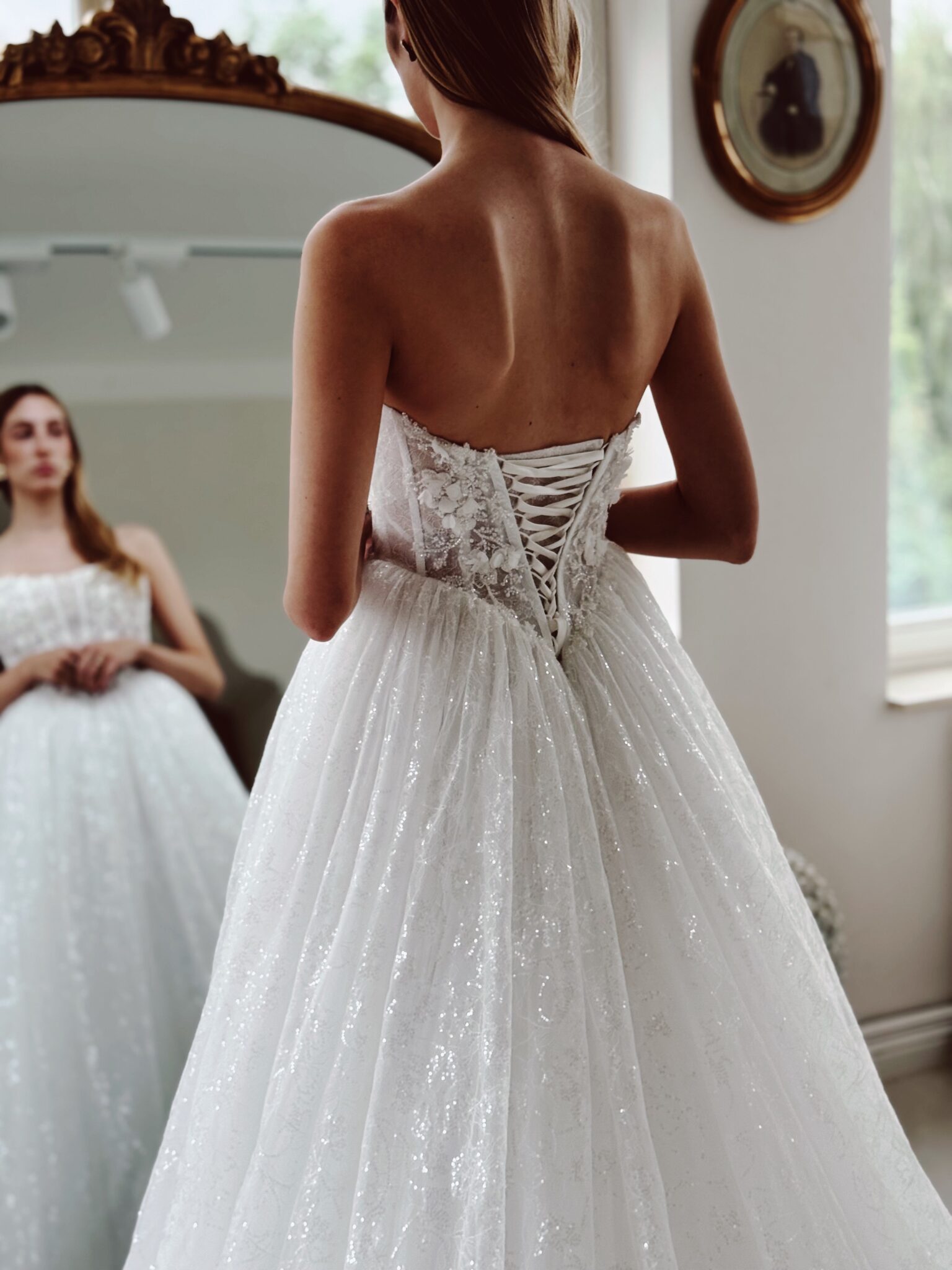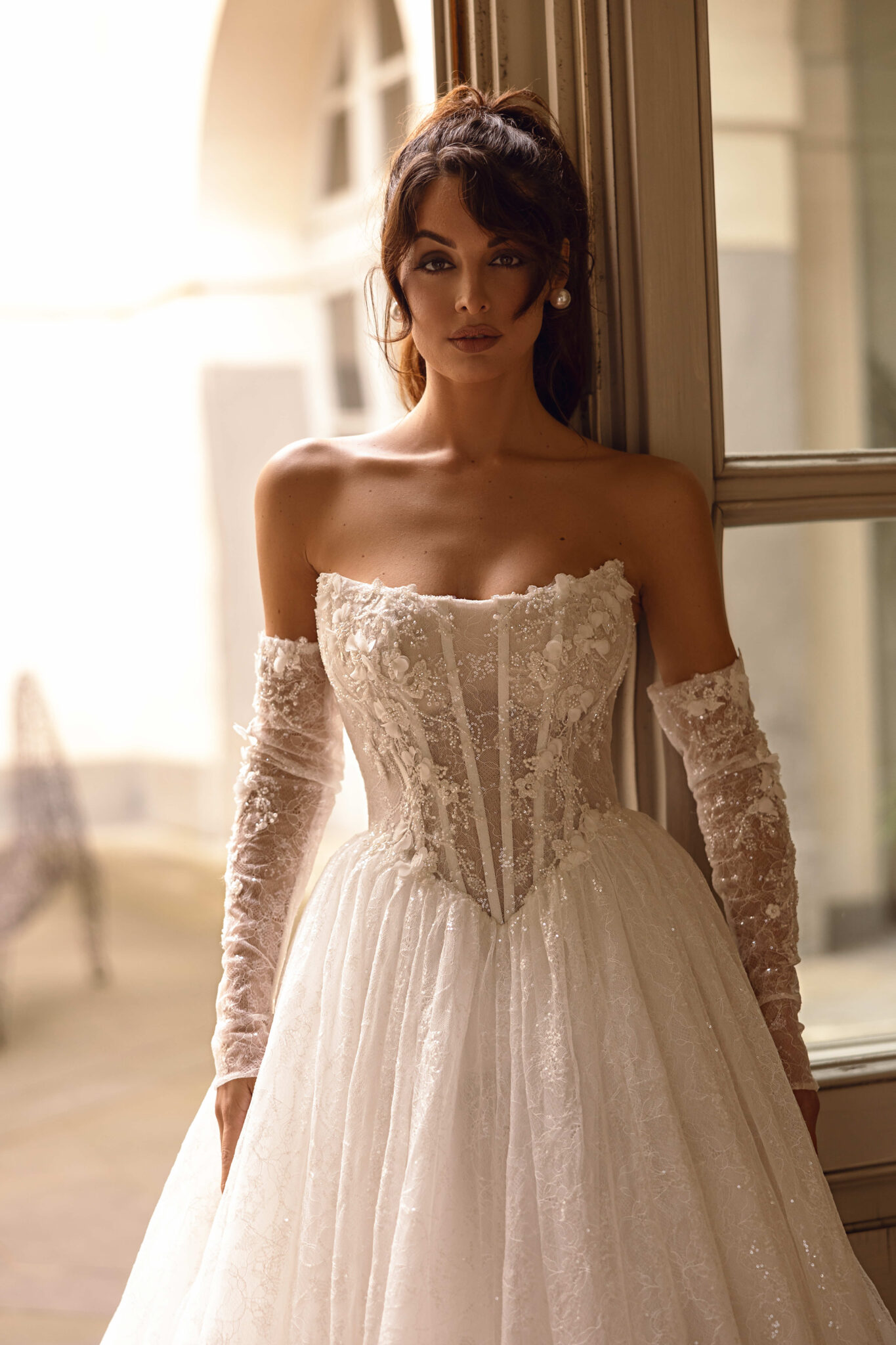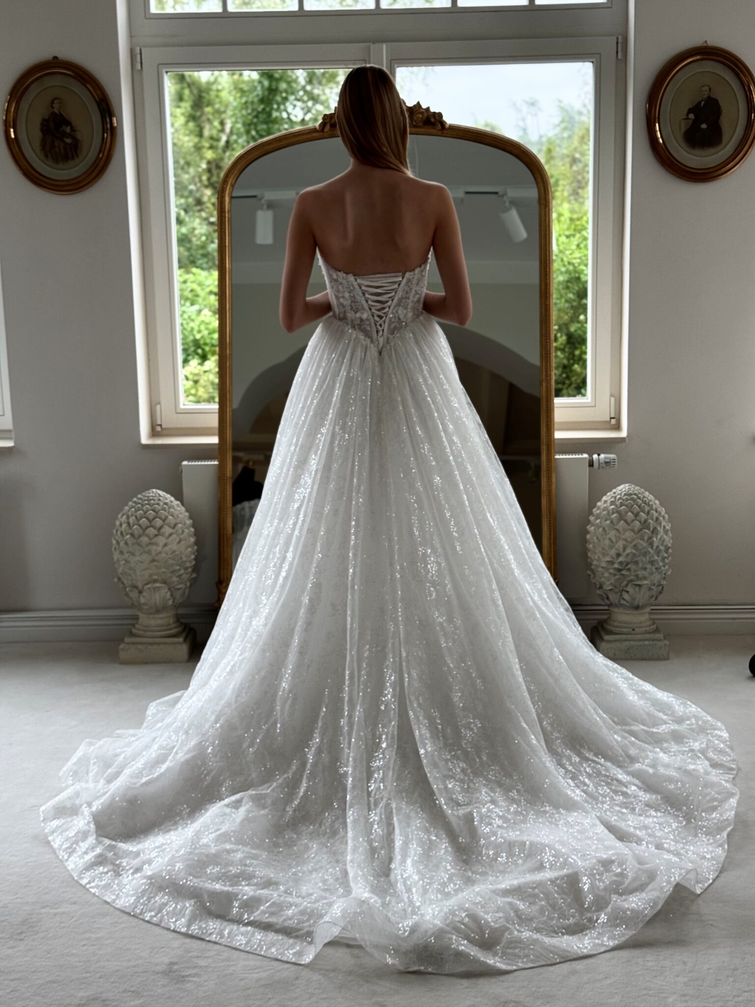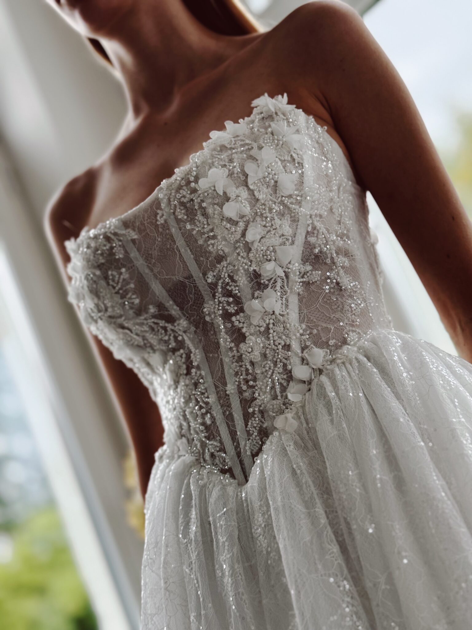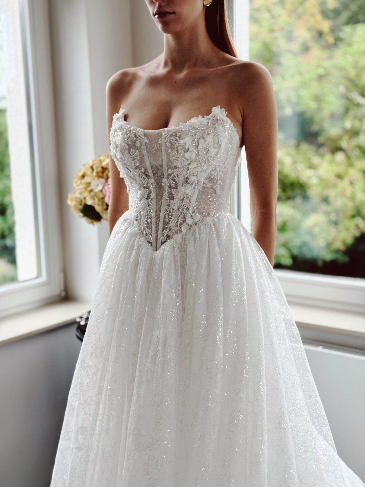 A-Linie mit einer transparenten Korsage, 3D-Spitzenapplikationen und einer baskischen Taille. Das Kleid in Gr. 36 passte gut: Unser Model ist 1,78 m, trägt Gr. 36/38 und hat Körbchengröße: 75E mit den Maßen: B: 89cm, T: 66cm, H:97cm.
