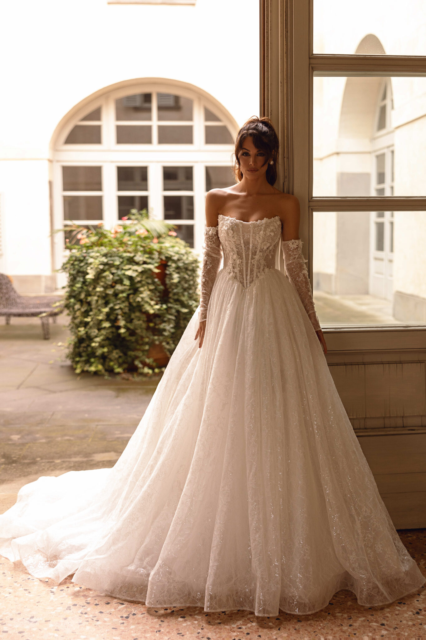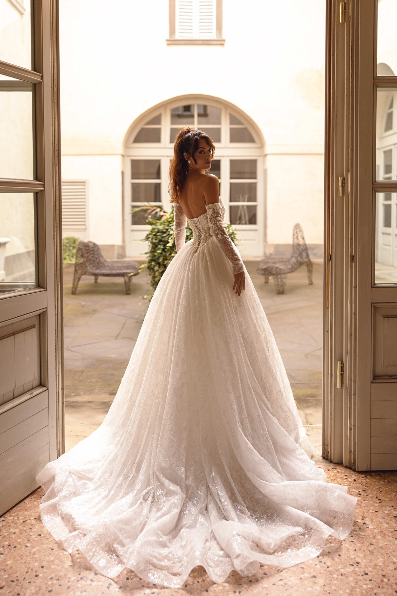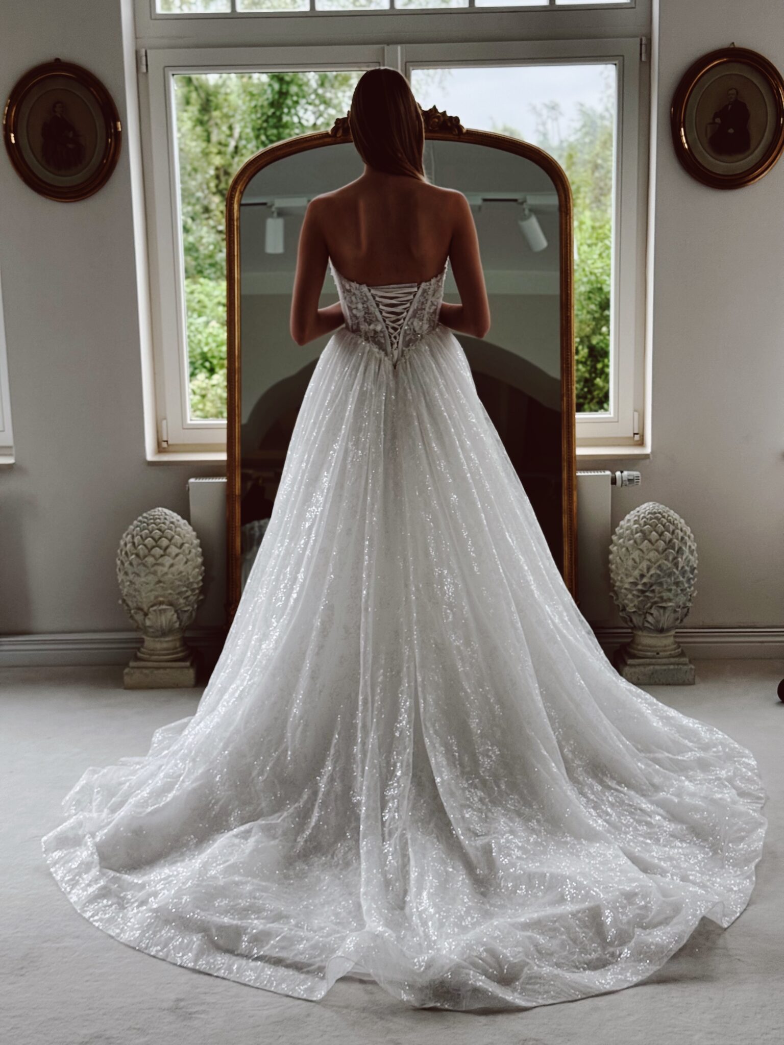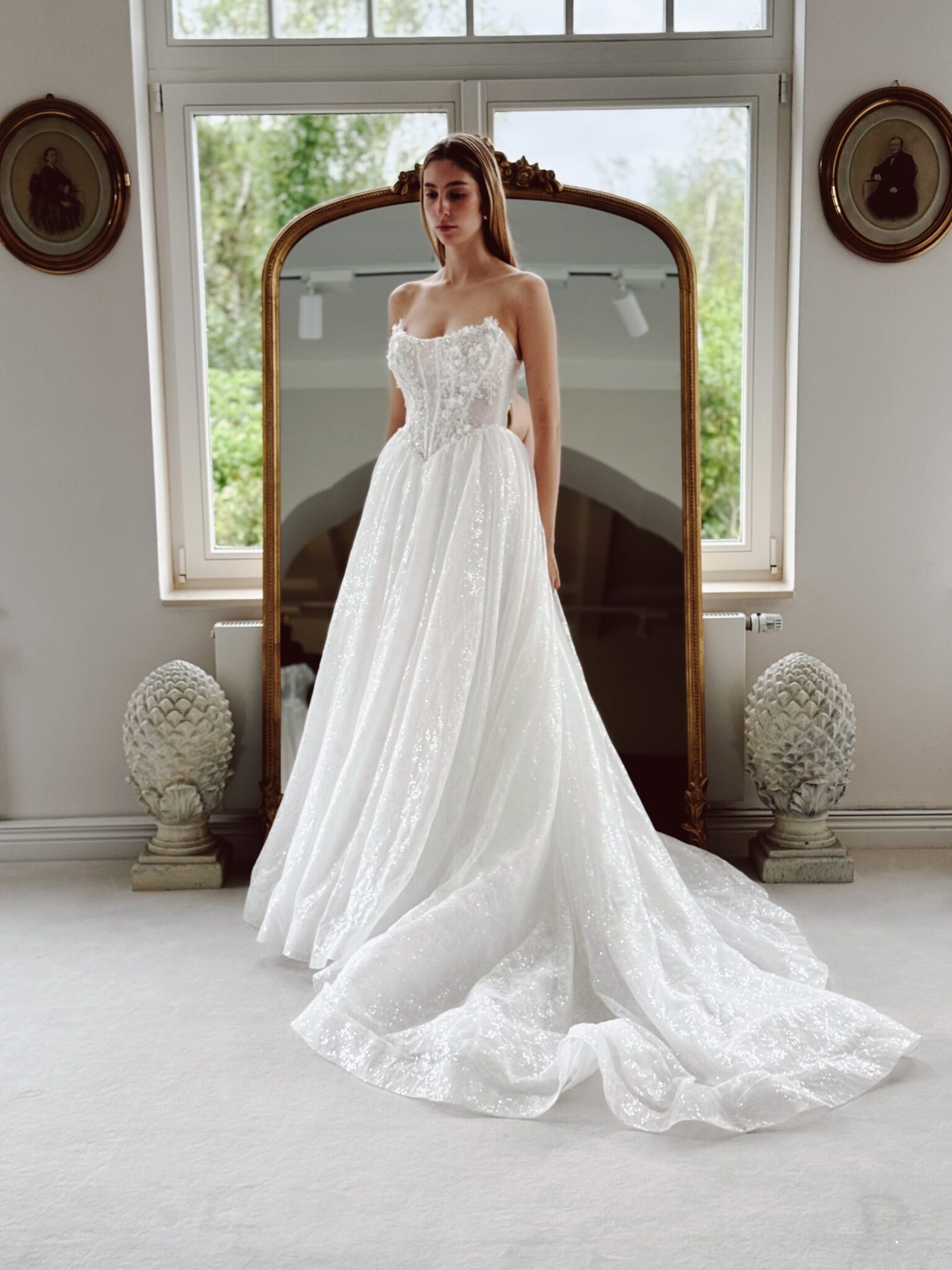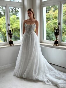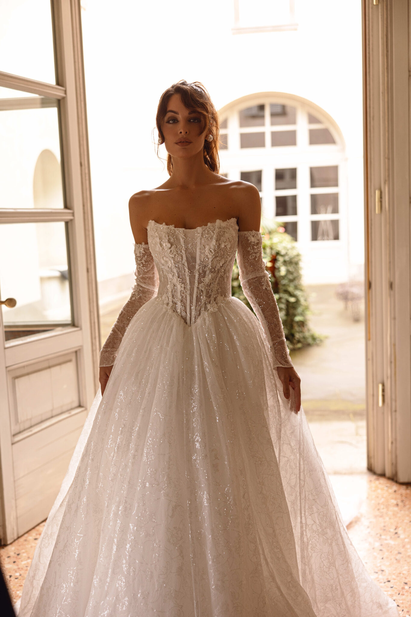A-Linie mit einer transparenten Korsage, 3D-Spitzenapplikationen und einer baskischen Taille. Das Kleid in Gr. 36 passte gut: Unser Model ist 1,78 m, trägt Gr. 36/38 und hat Körbchengröße: 75E mit den Maßen: B: 89cm, T: 66cm, H:97cm.