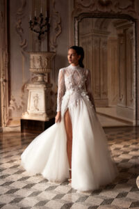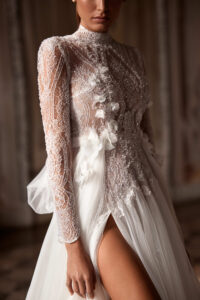 Designer A-Linie von Milla Nova QUENTINE mit 3D-Blüten, zarter Glitzer-Spitze in der Korsage, hochgeschlossen & Langarm. Empfehlung: nur bis C-Cup. Das Kleid in Gr. 40 musste entsprechend abgesteckt werden: Unser Model ist 1,78 m, trägt Gr. 36/38 und hat Körbchengröße: 75E mit den Maßen: B: 89cm, T: 66cm, H:97cm.