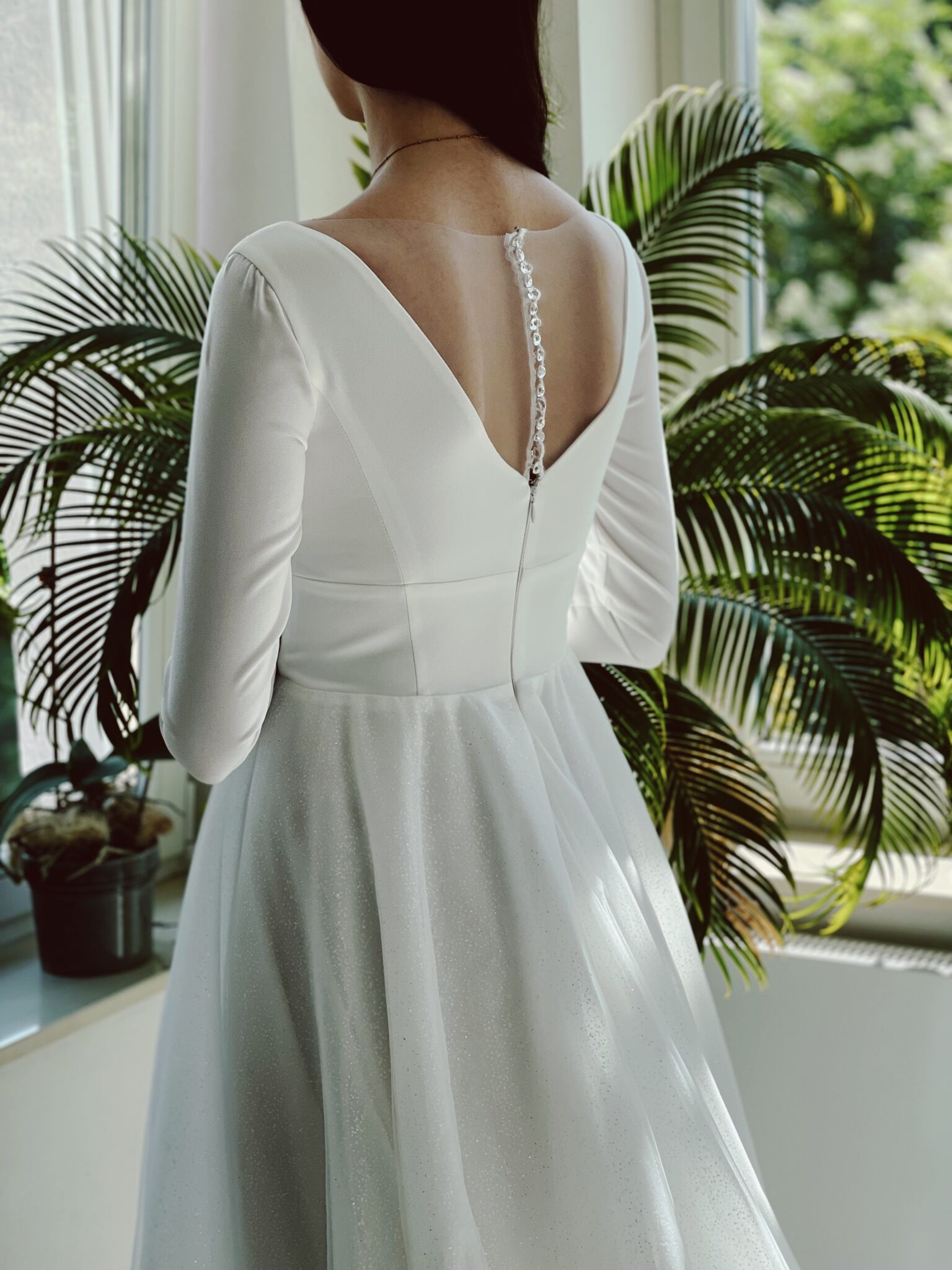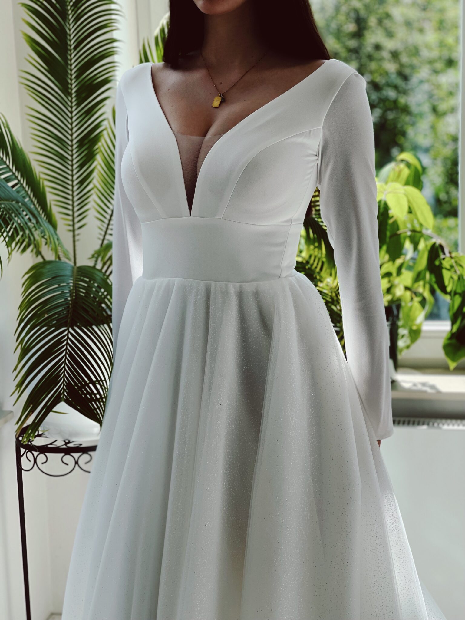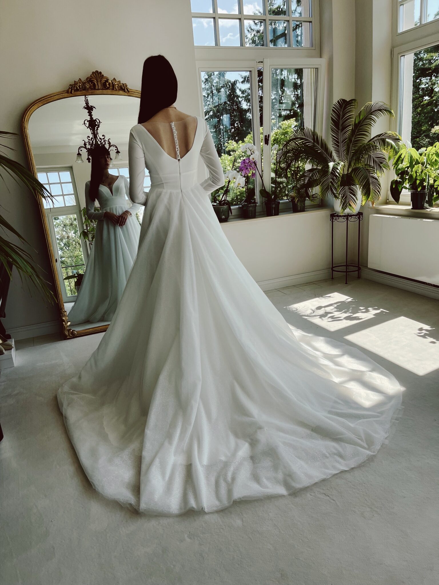 Cleane langarm A-Linie aus Crepe & Glitzertüll im Rock. Der Rücken kann auf Wunsch geöffnet werden. Unser Model ist 1,78 m, trägt Gr. 36/38 und hat Körbchengröße: 75E mit den Maßen: B: 89cm, T: 66cm, H:97cm.