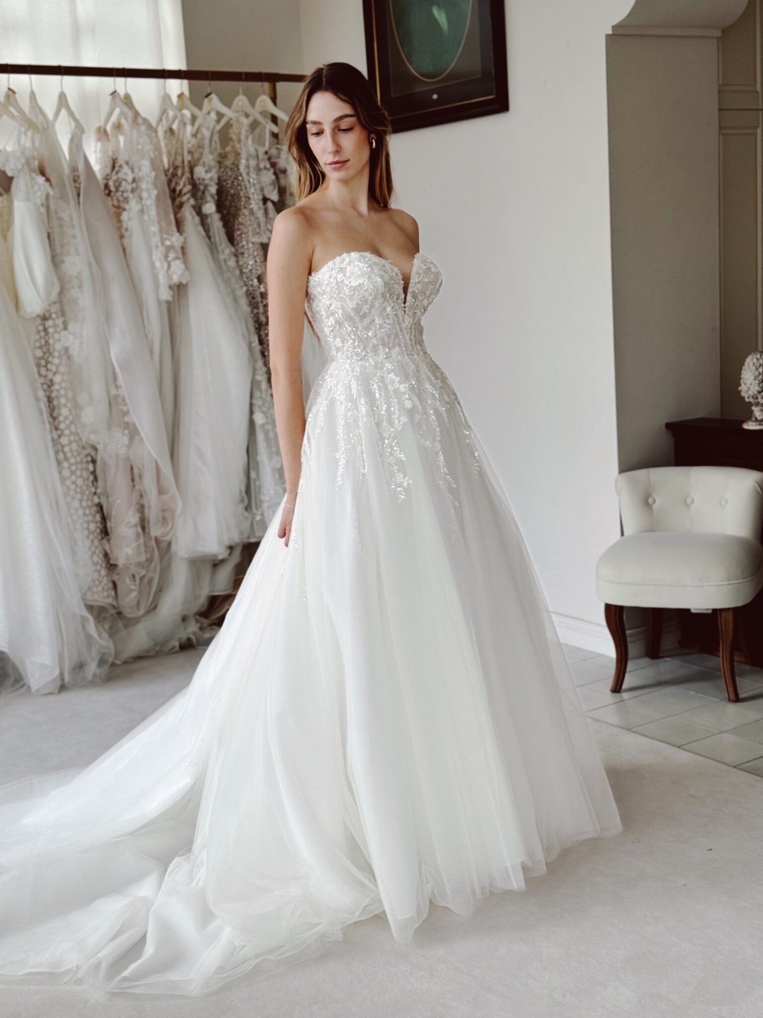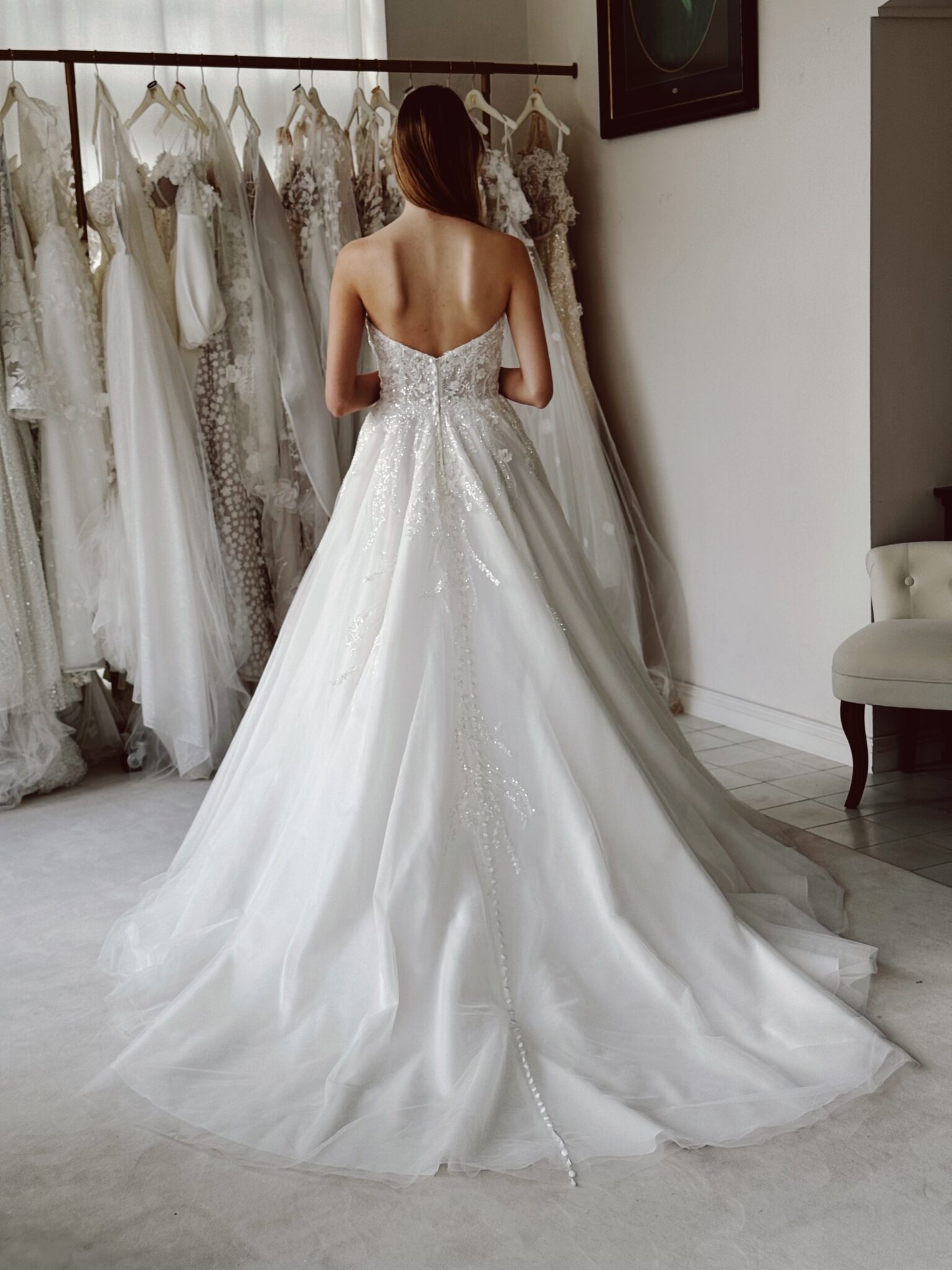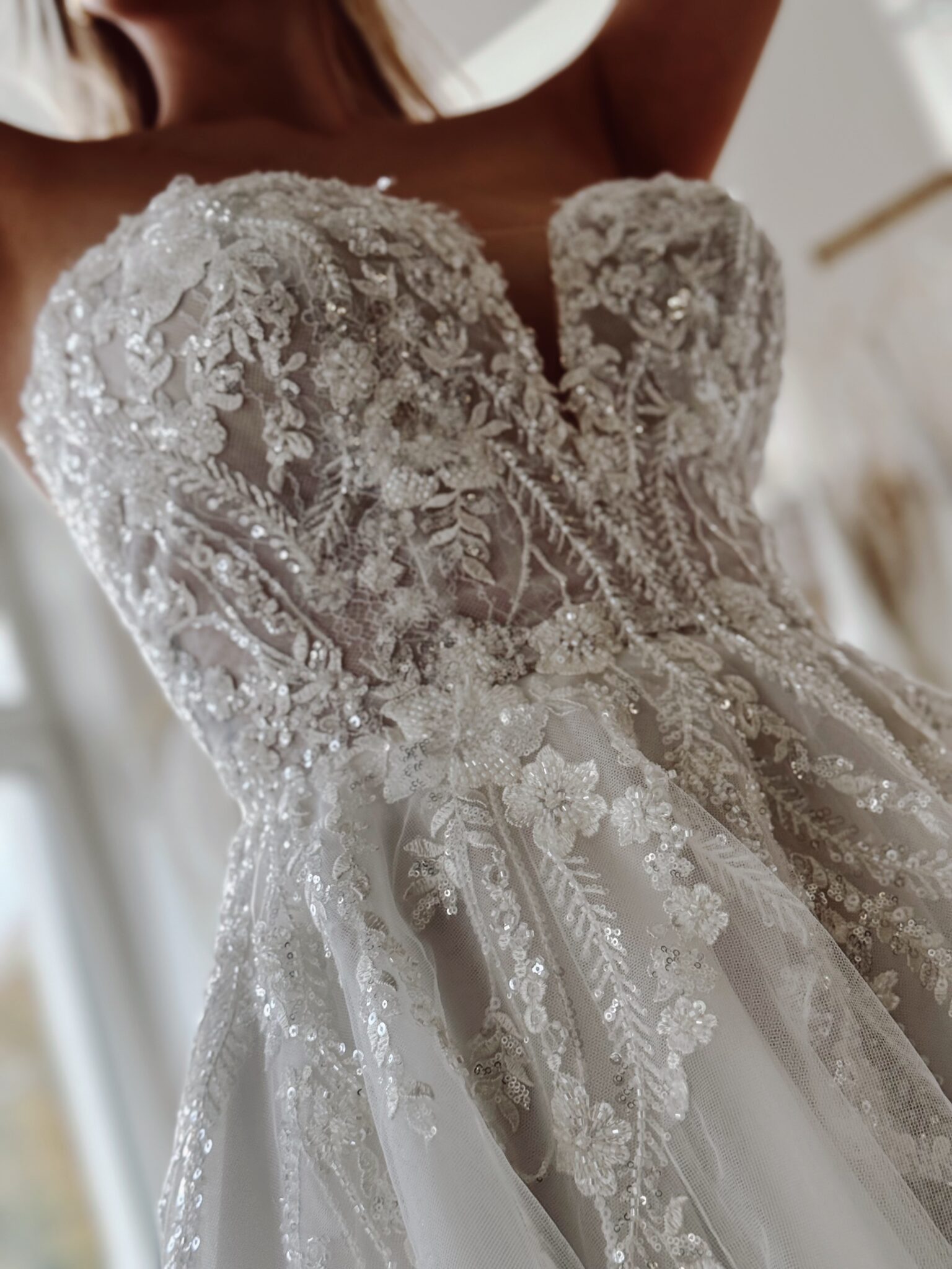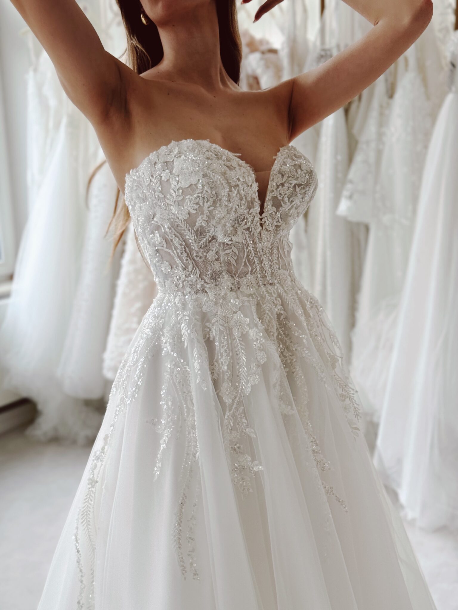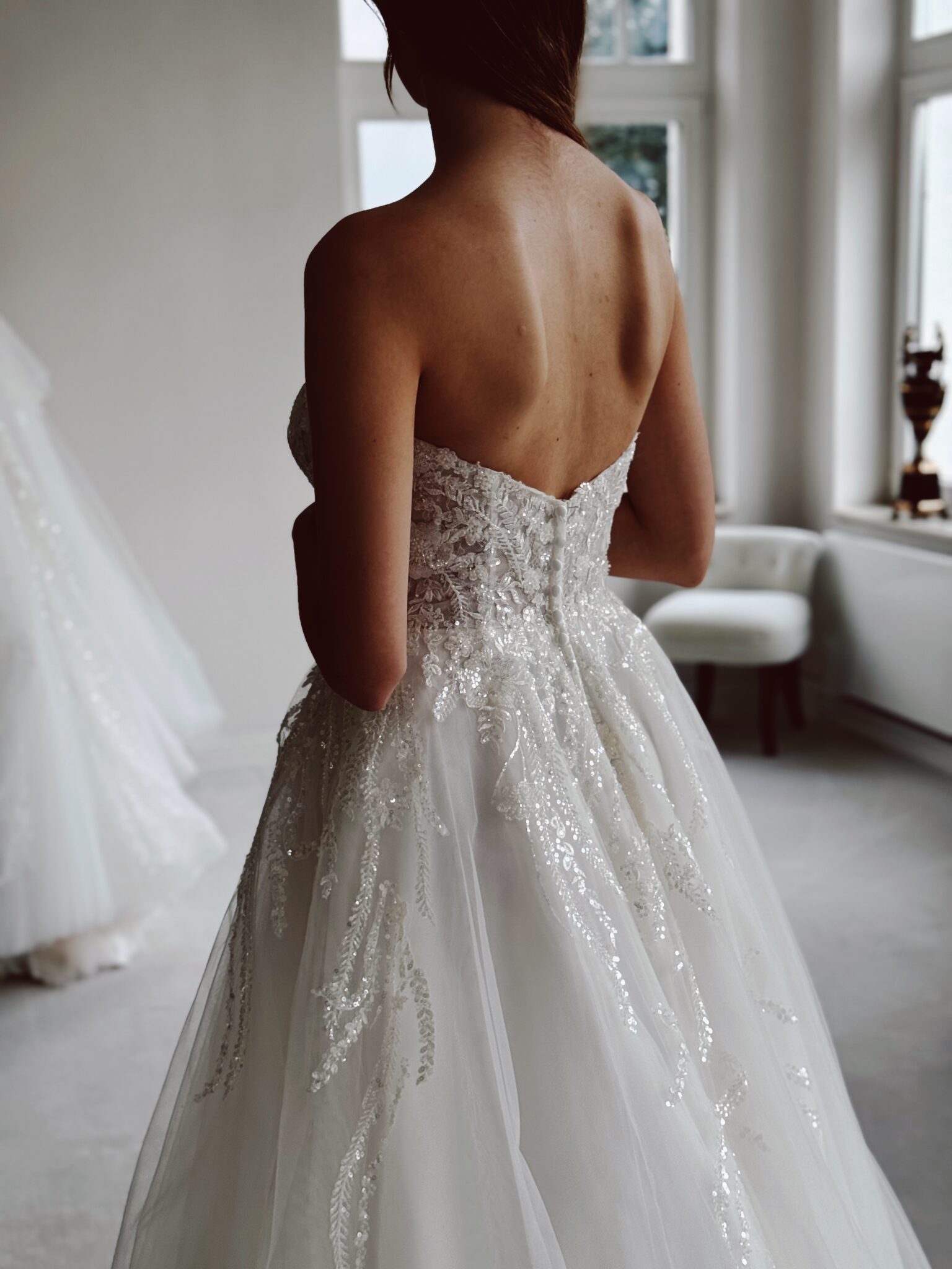 A-Linie mit Glitzer-Spitzenapplikationen in der Corsage, einem Cut Out im Dekolleté und einer Knopfleiste im Rücken, die bis hin zur Schleppe führt. Das Kleid in Gr. 36 passte gut: Unser Model ist 1,78 m, trägt Gr. 36/38 und hat Körbchengröße: 75E mit den Maßen: B: 89cm, T: 66cm, H:97cm.