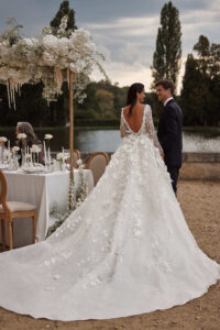 Designer A-Linie / Prinzessin von Milla Nova SUMMER mit großen 3-D Blüten und Glitzerranken, tiefem Ausschnitt, langen Ärmeln & Schnürung im Rücken. Das Kleid in Gr. 38 war etwas locker: Unser Model ist 1,78 m, trägt Gr. 36/38 und hat Körbchengröße: 75E mit den Maßen: B: 89cm, T: 66cm, H:97cm.