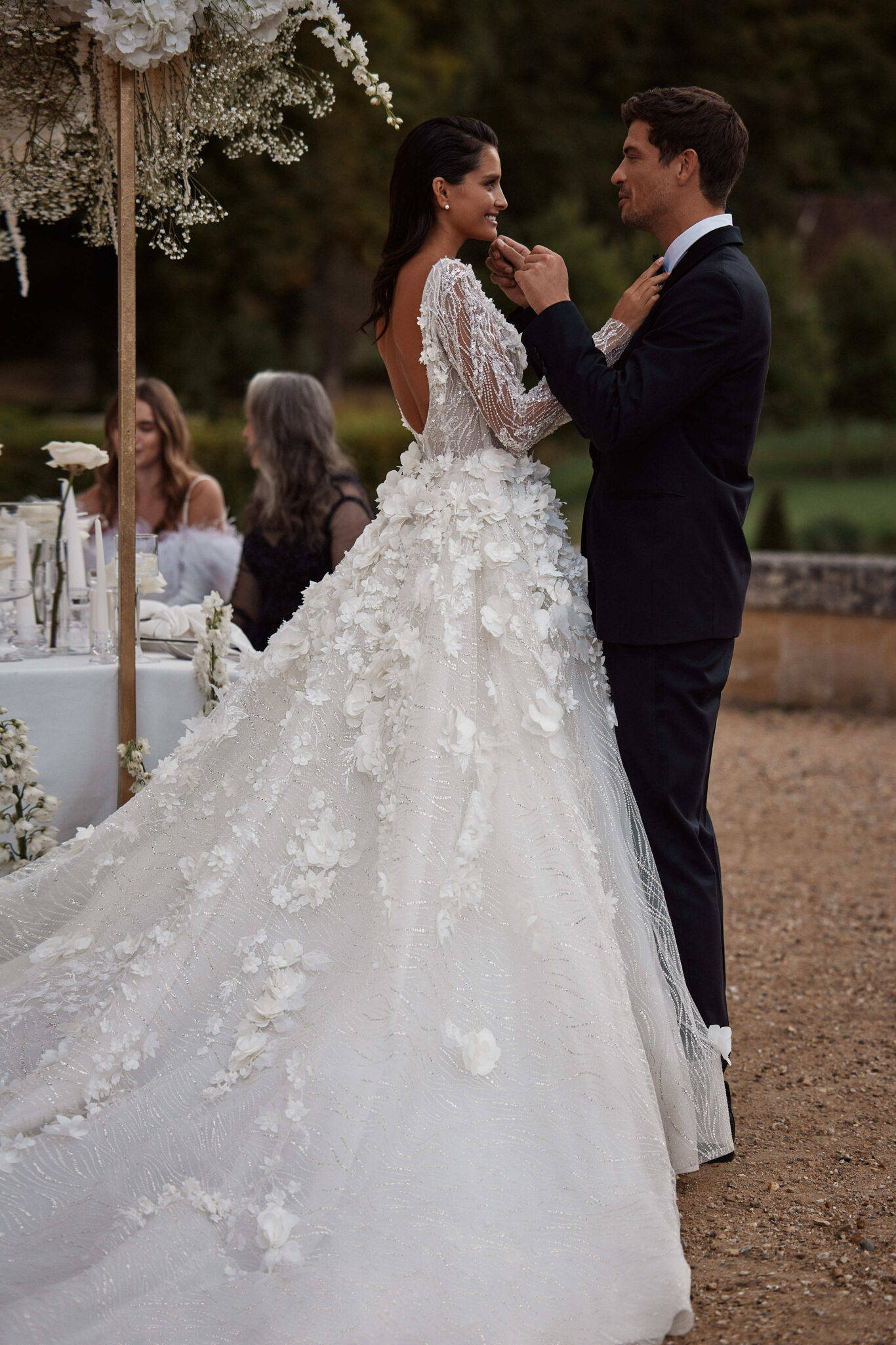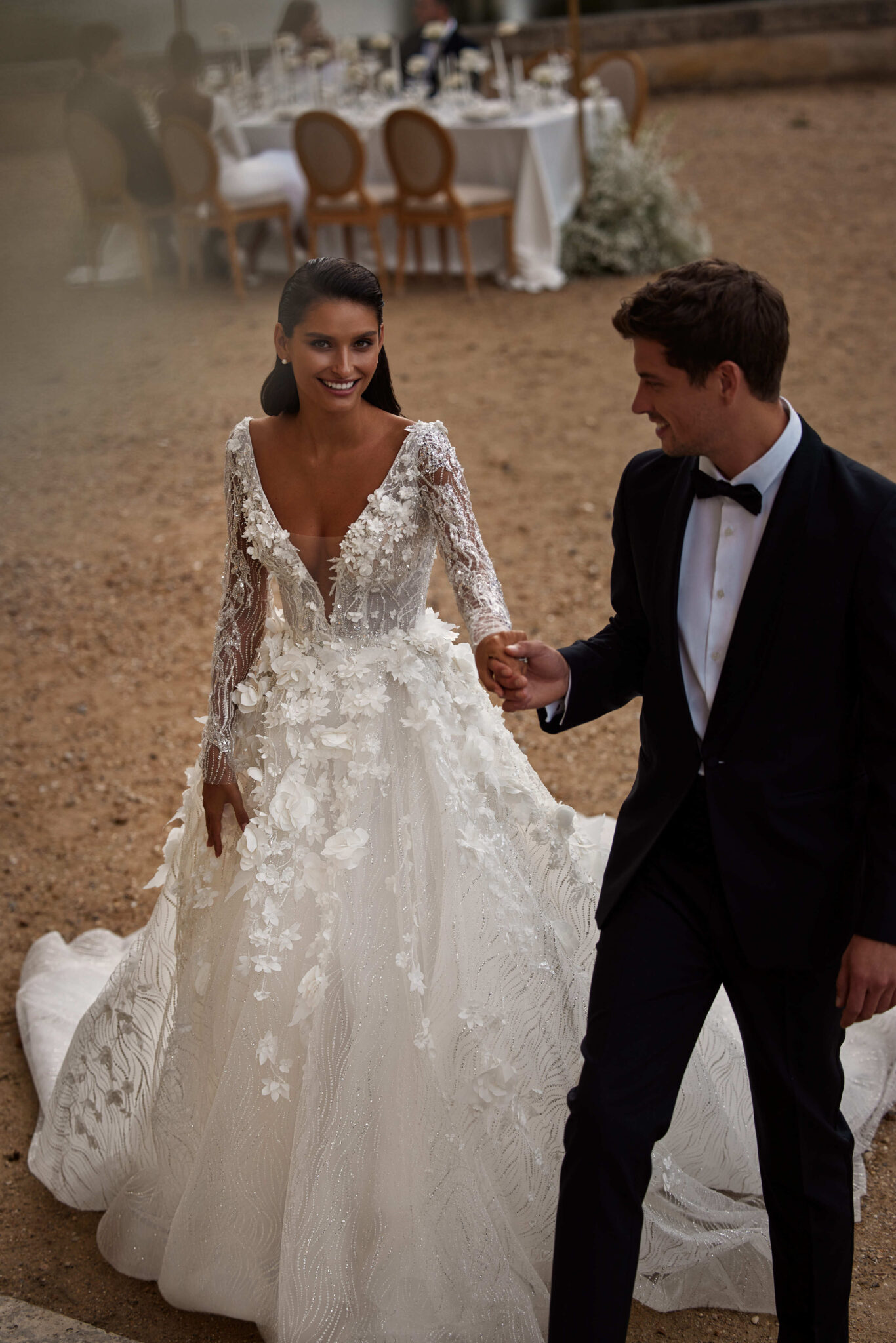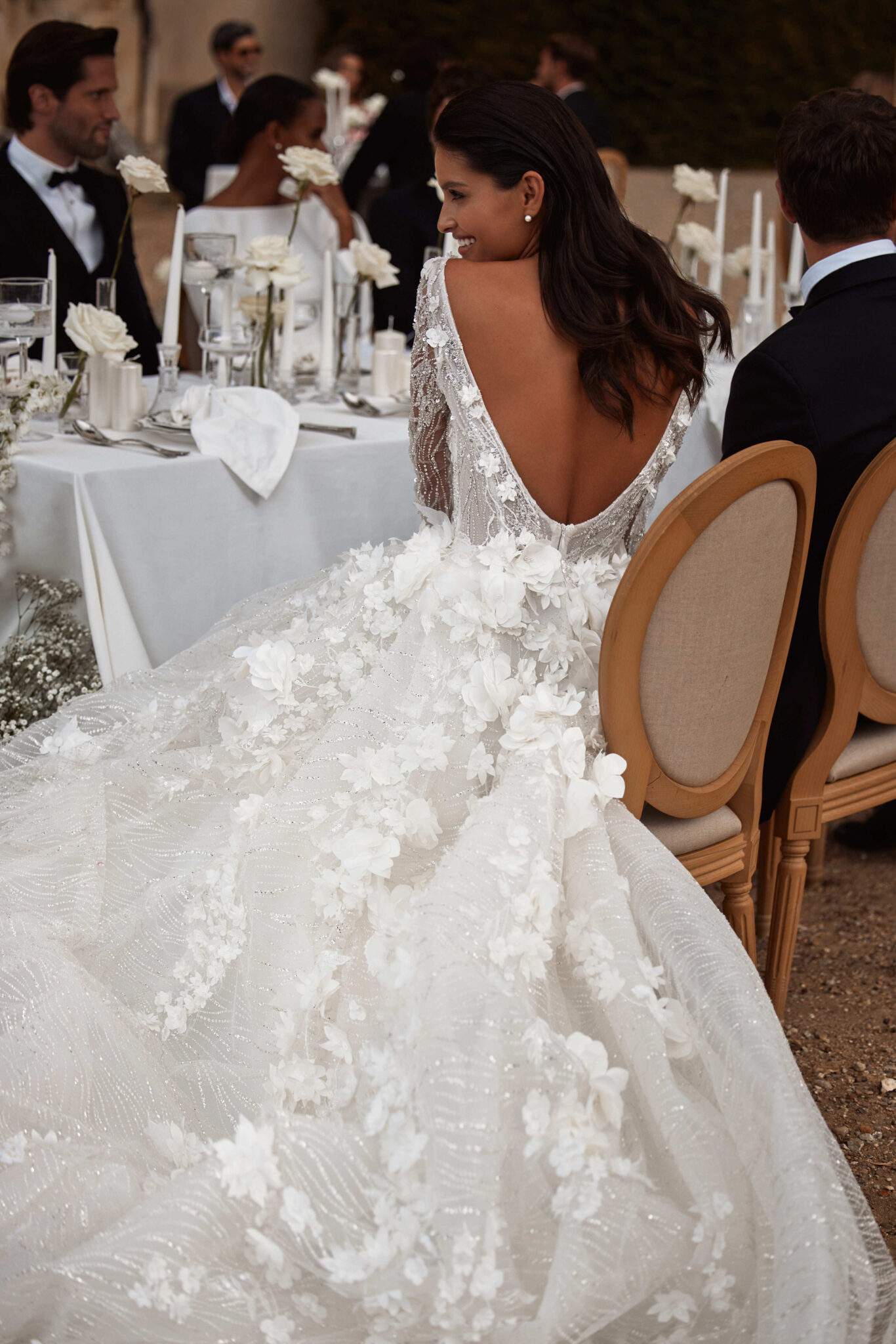Designer A-Linie / Prinzessin von Milla Nova SUMMER mit großen 3-D Blüten und Glitzerranken, tiefem Ausschnitt, langen Ärmeln & Schnürung im Rücken. Das Kleid in Gr. 38 war etwas locker: Unser Model ist 1,78 m, trägt Gr. 36/38 und hat Körbchengröße: 75E mit den Maßen: B: 89cm, T: 66cm, H:97cm.