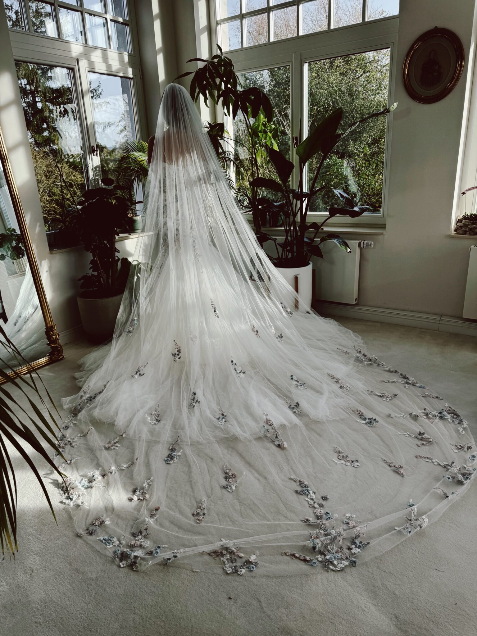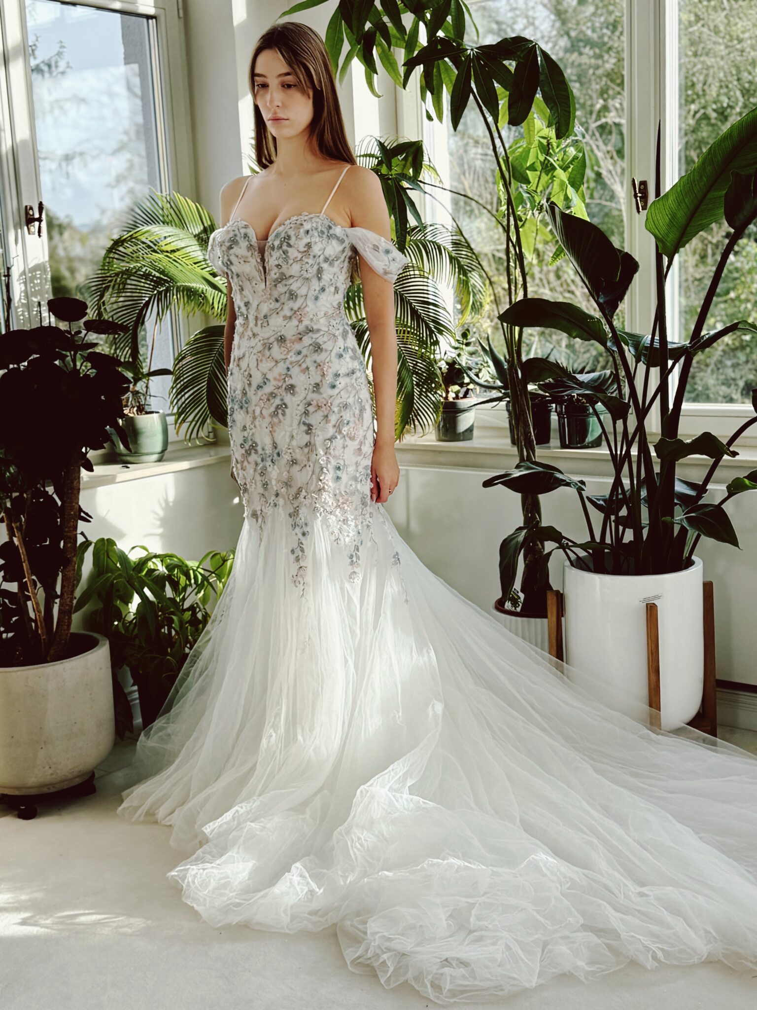 Fit & flare Brautkleid mit zarten 3D-Blüten in grau, rosé und hellblau und Carmen-Trägern. Durch den Crash-Tüll erhält das Kleid eine besondere Leichtigkeit. Abnehmbare Ärmel mit bestickten Blüten gehören ebenfalls zu dem Kleid, sind hier aber nicht abgebildet. Ein passender Schleier ist dazu erhältlich. Das Kleid in Gr. 38 wurde leicht abgesteckt. Halt bei großer Oberweite ist wie hier nur mit Spaghetti-Trägern möglich: Farbe: ivory/sand. Unser Model ist 1,78 m, trägt Gr. 36/38 und hat Körbchengröße: 75E mit den Maßen: B: 89cm, T: 66cm, H:97cm.