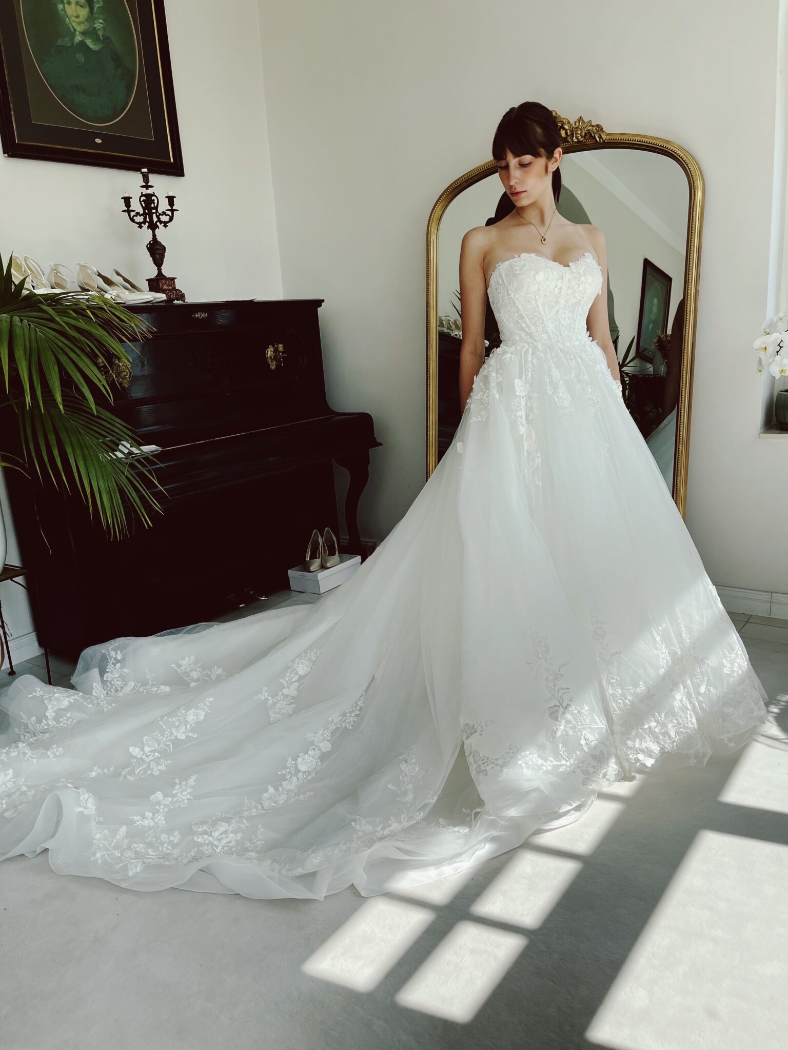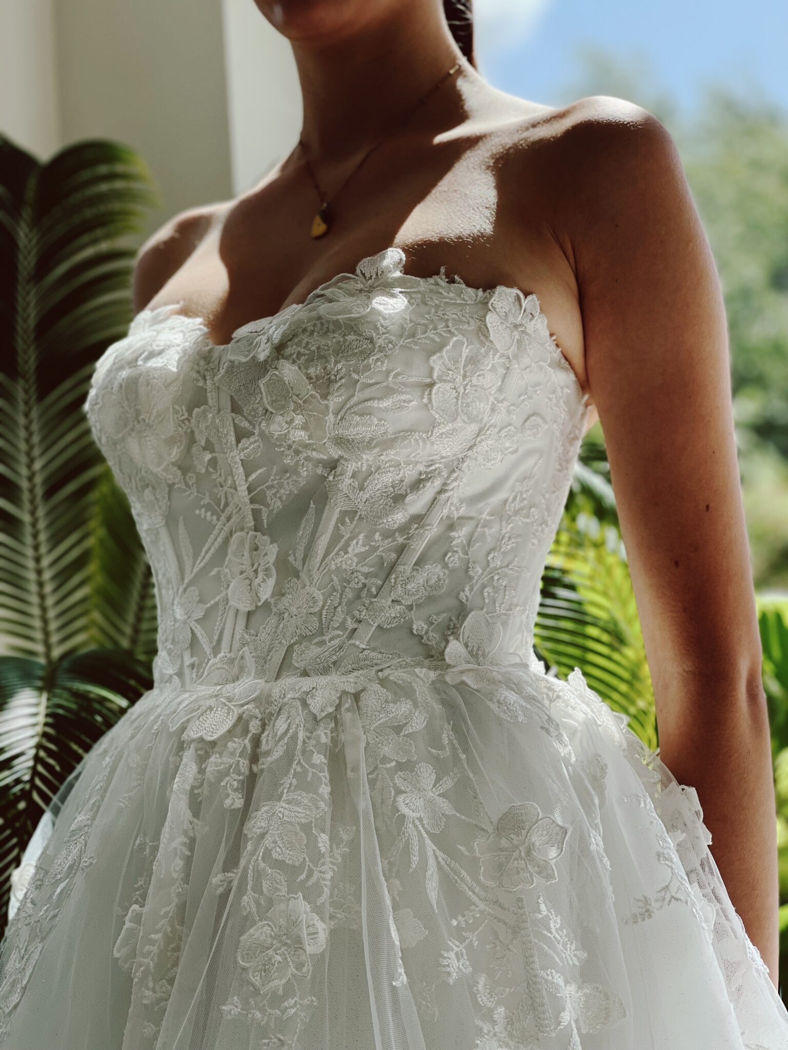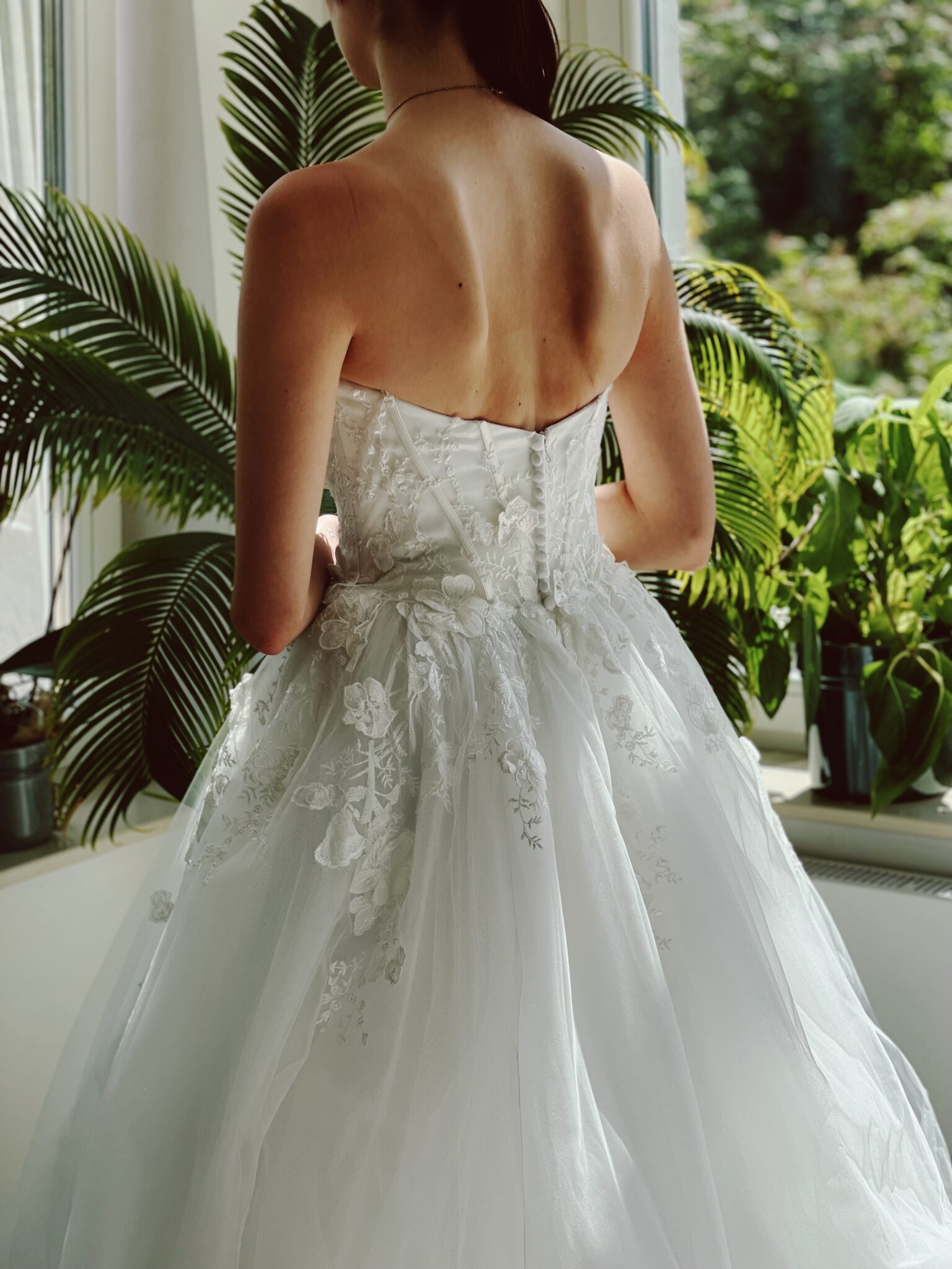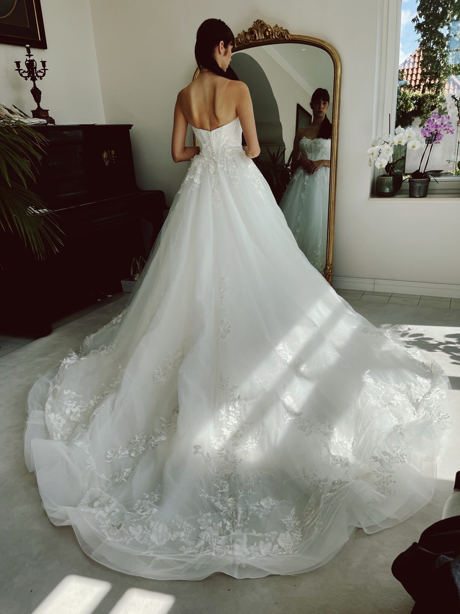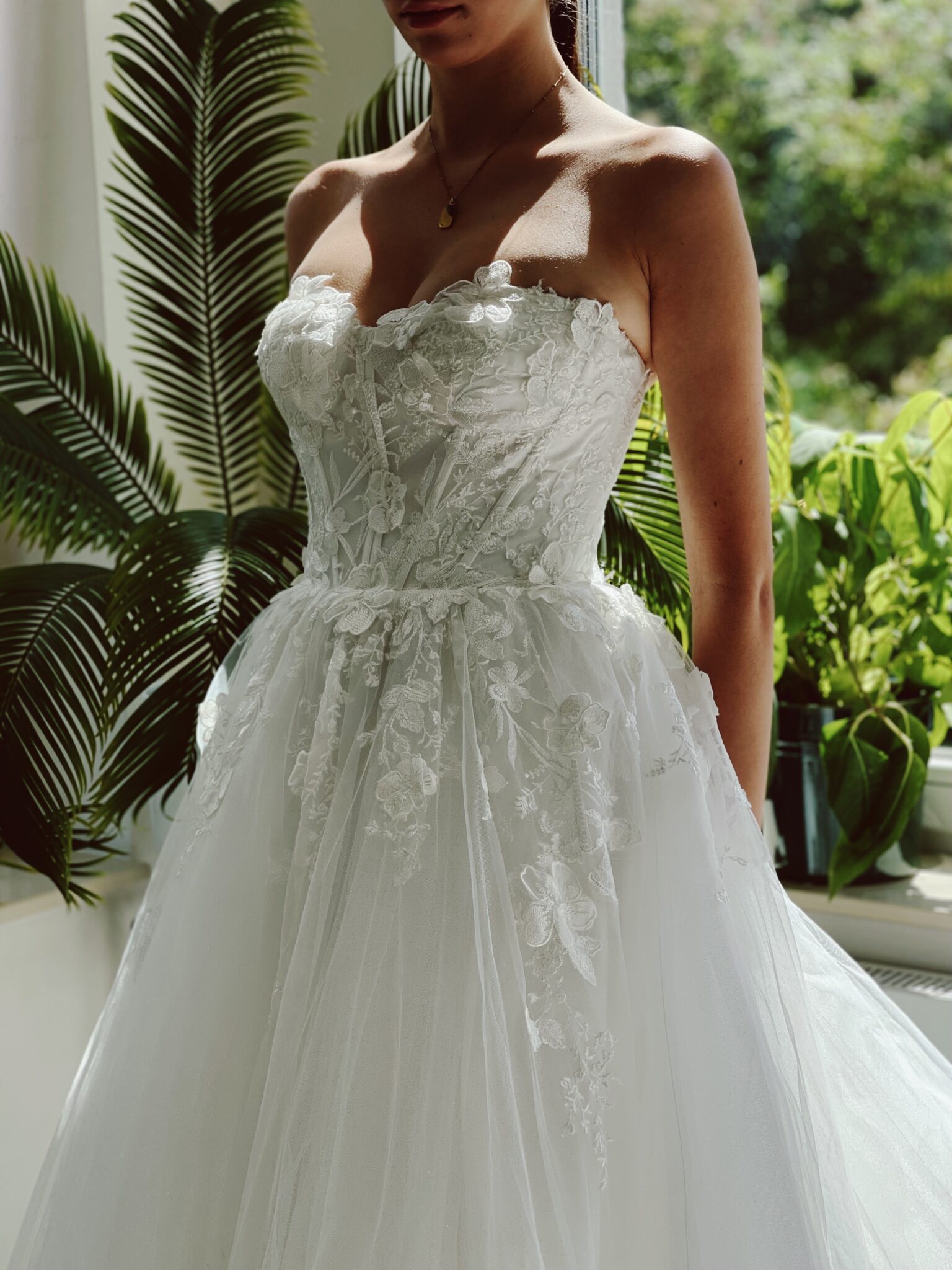 Klassische Prinzessin mit floralen 3-D-Glitzer-Spitzenapplikationen in der Korsage im blickdichtem Lingerie-Look, Glitzertüll in der 2. Lage. Die Gr. 36 fällt klein aus: Unser Model ist 1,78 m, trägt Gr. 36/38 und hat Körbchengröße: 75E mit den Maßen: B: 89cm, T: 66cm, H:97cm.