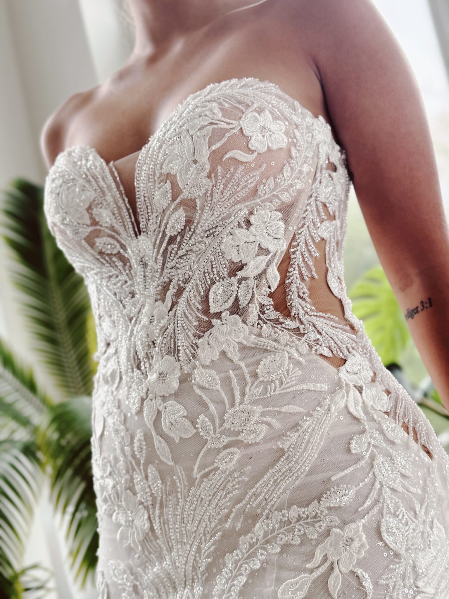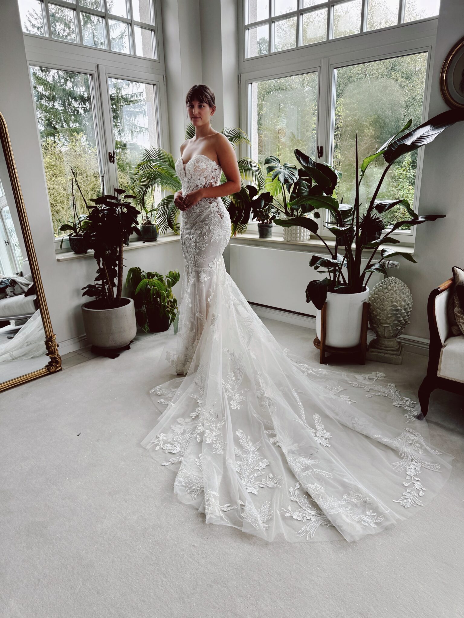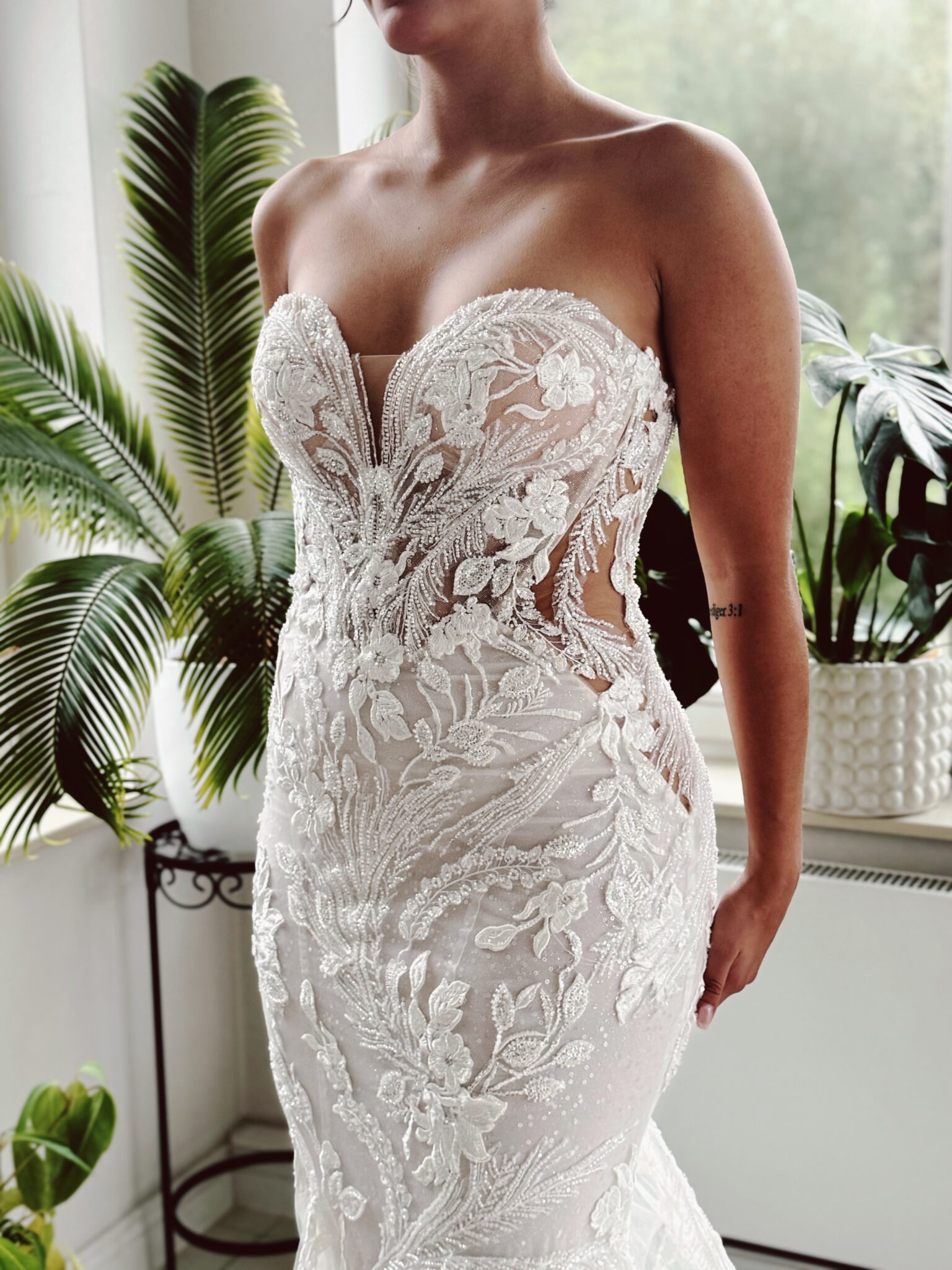 Fit & flare Brautkleid von Enzoani TALIANA aus floralen Glitzer-Spitzenapplikationen, Cut Outs an den Seiten, Tattoo-Effekt im Rücken, Glitzertüll, Transparenz im leichten Lingerie-Look & atemberaubender Schleppe. Die Gr. 36 saß gut an der Hüfte, fällt aber groß aus: Unser Model ist 1,68 m, trägt Gr. 36/38 und hat Körbchengröße: 75A mit den Maßen: B: 89cm, T: 69cm, H:110cm.