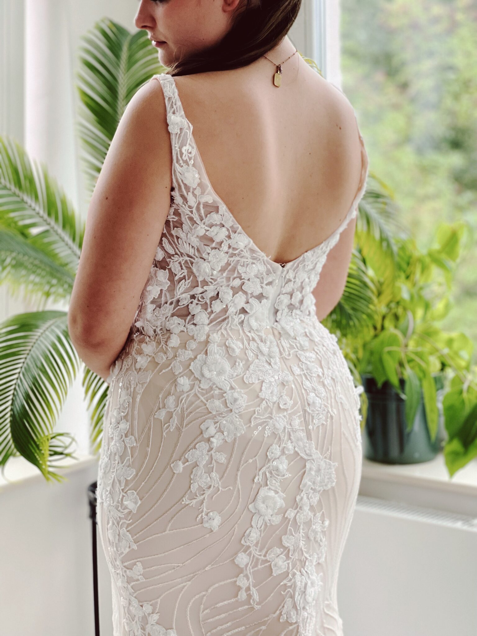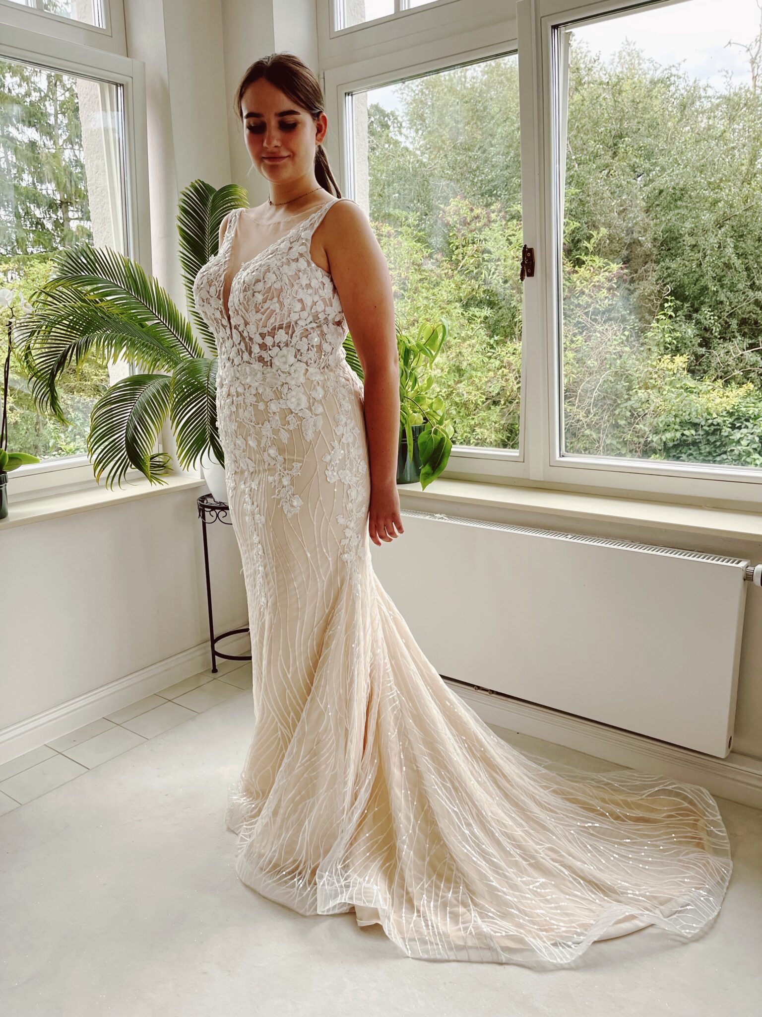 Fit & flare-Brautkleid mit floralen 3D-Glitzer-Spitzenapplikationen auf Ranken-Glitzer-Stoff. Farbe: ivory/champaign: Die Größen fallen klein aus: Unser Model ist 1,77 m, trägt Gr. 44 und hat Körbchengröße: 80D mit den Maßen: B: 102cm, T: 81cm, H:120cm.
