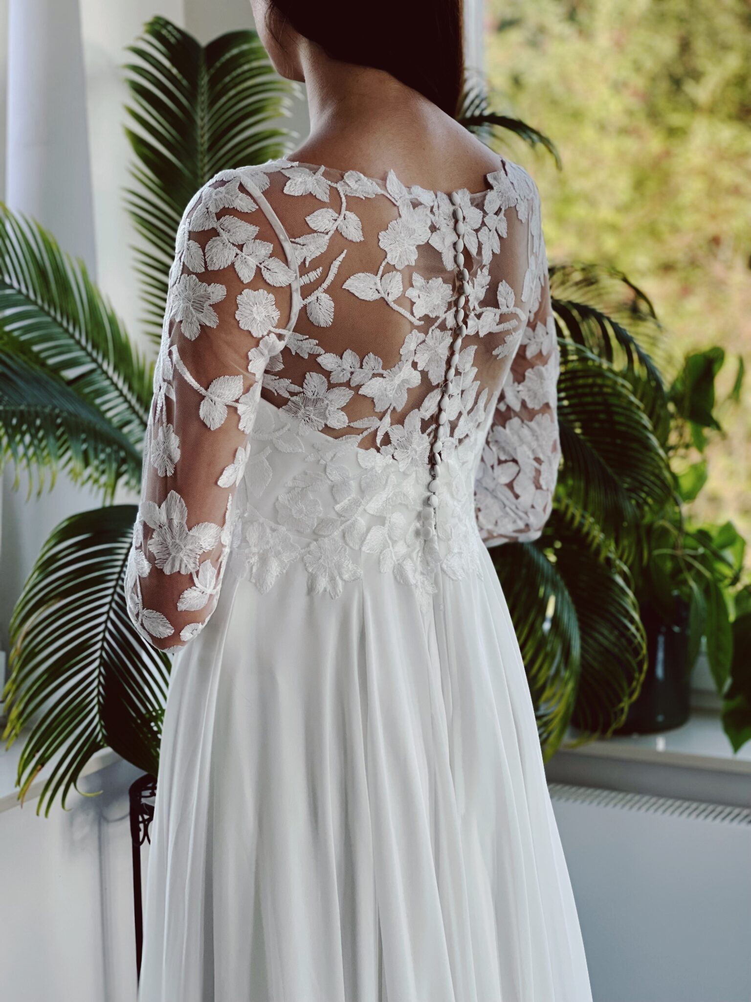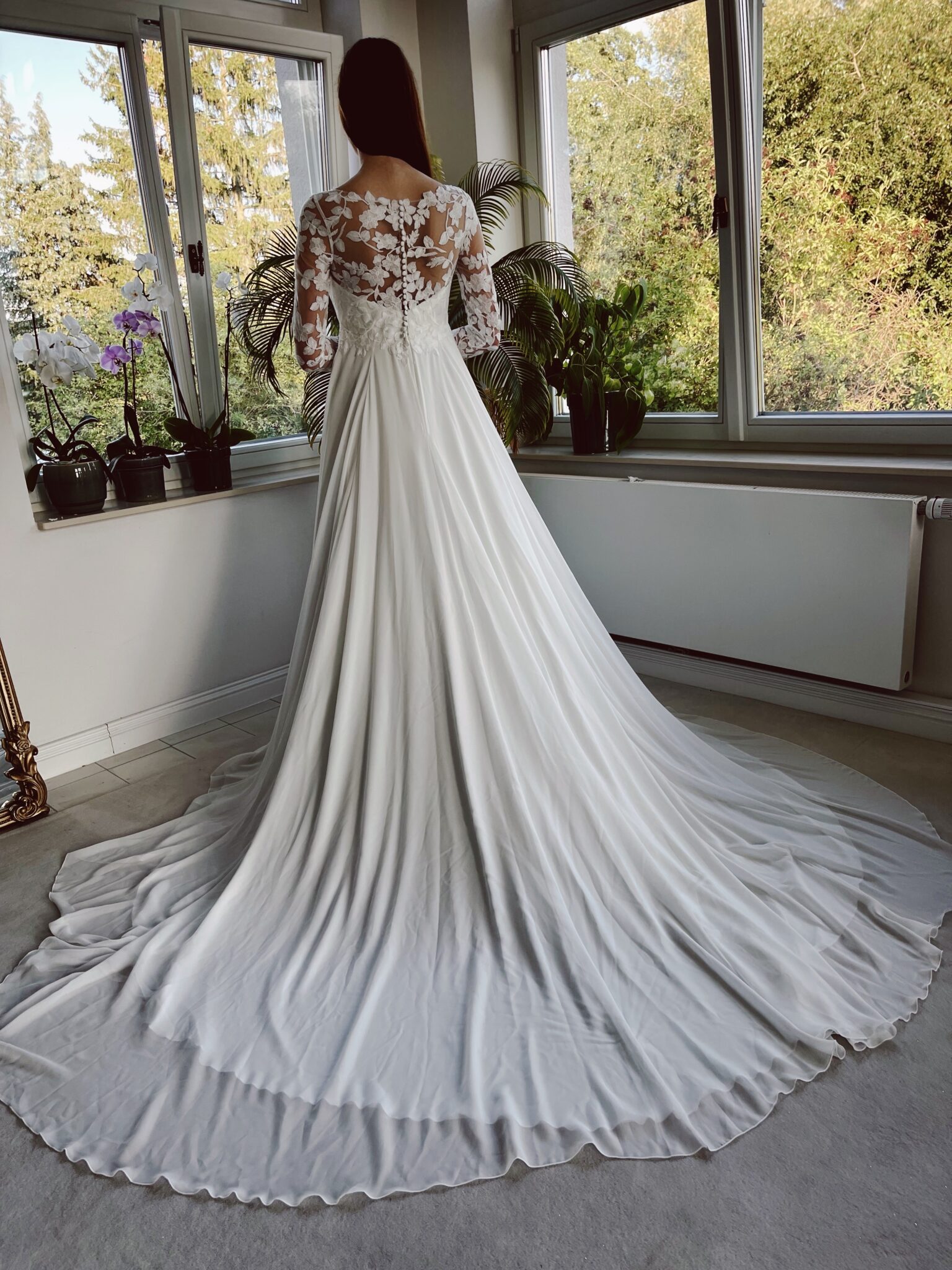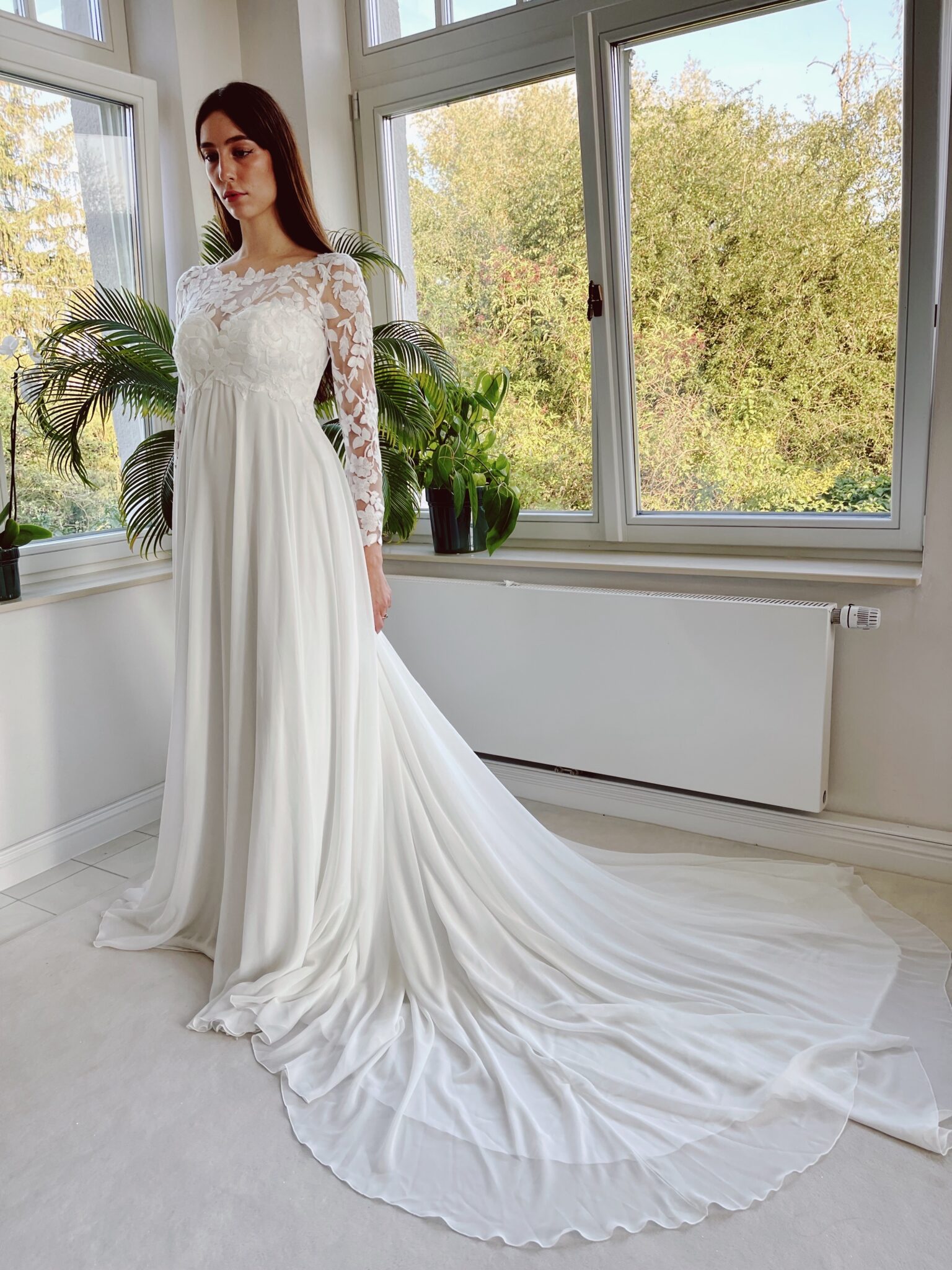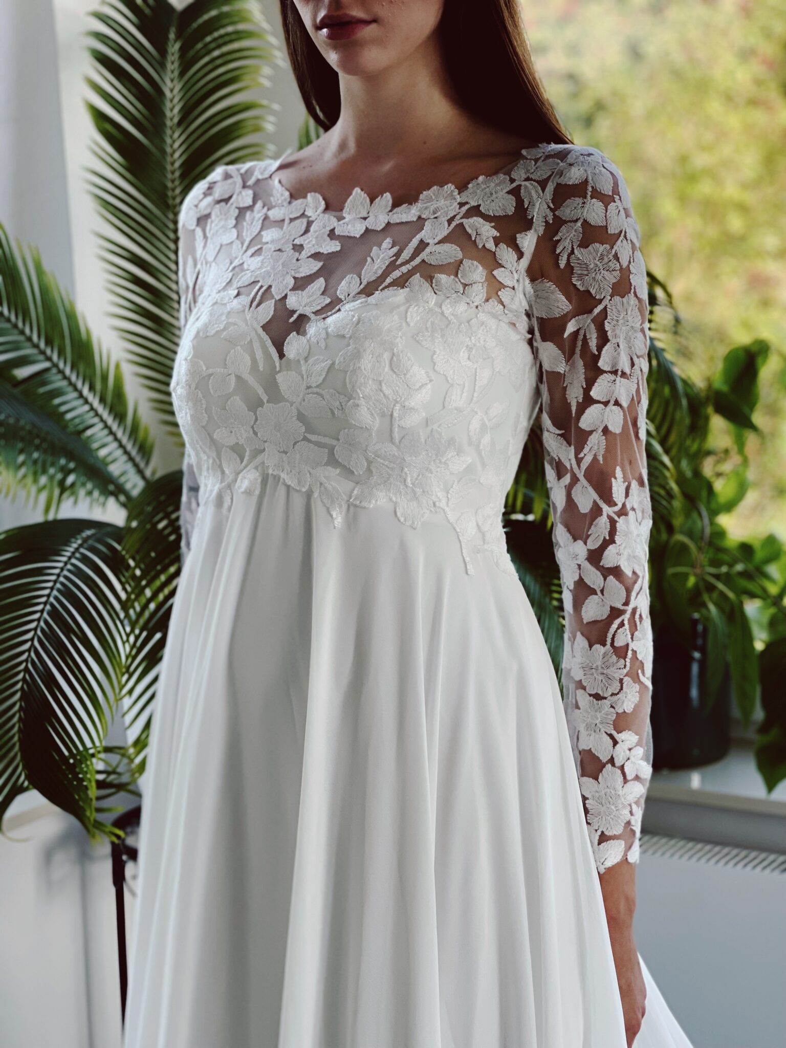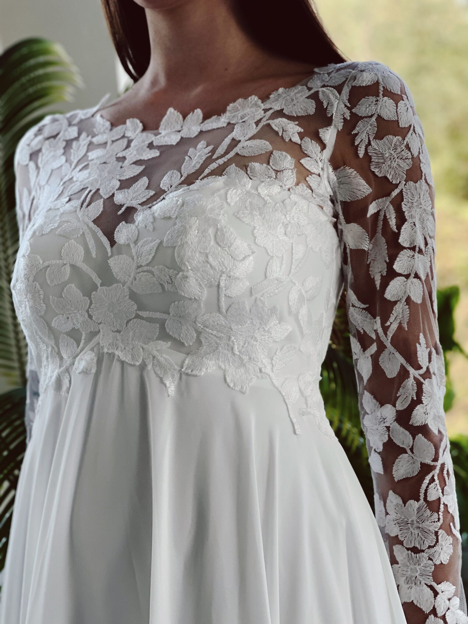 Zarte Chiffon-A-Linie mit matten Blütenapplikationen in der Korsage, langarm & Schlüsselloch-Ausschnitt im Rücken. Tolles Schwangerschafts-Brautkleid. Farbe: ivory/champaign: Unser Model ist 1,78 m, trägt Gr. 36/38 und hat Körbchengröße: 75E mit den Maßen: B: 89cm, T: 66cm, H:97cm.