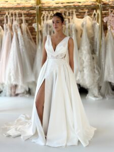 Cleane A-Linie mit tiefem V-Ausschnitt, Spitzenapplikationen in der Korsage, Cut-Outs an den Seiten und einem hohen Beinschlitz.Das Kleid in Gr. 34 passte: Unser Model ist 1,78 m, trägt Gr. 36/38 und hat Körbchengröße: 75E mit den Maßen: B: 89cm, T: 66cm, H:97cm.