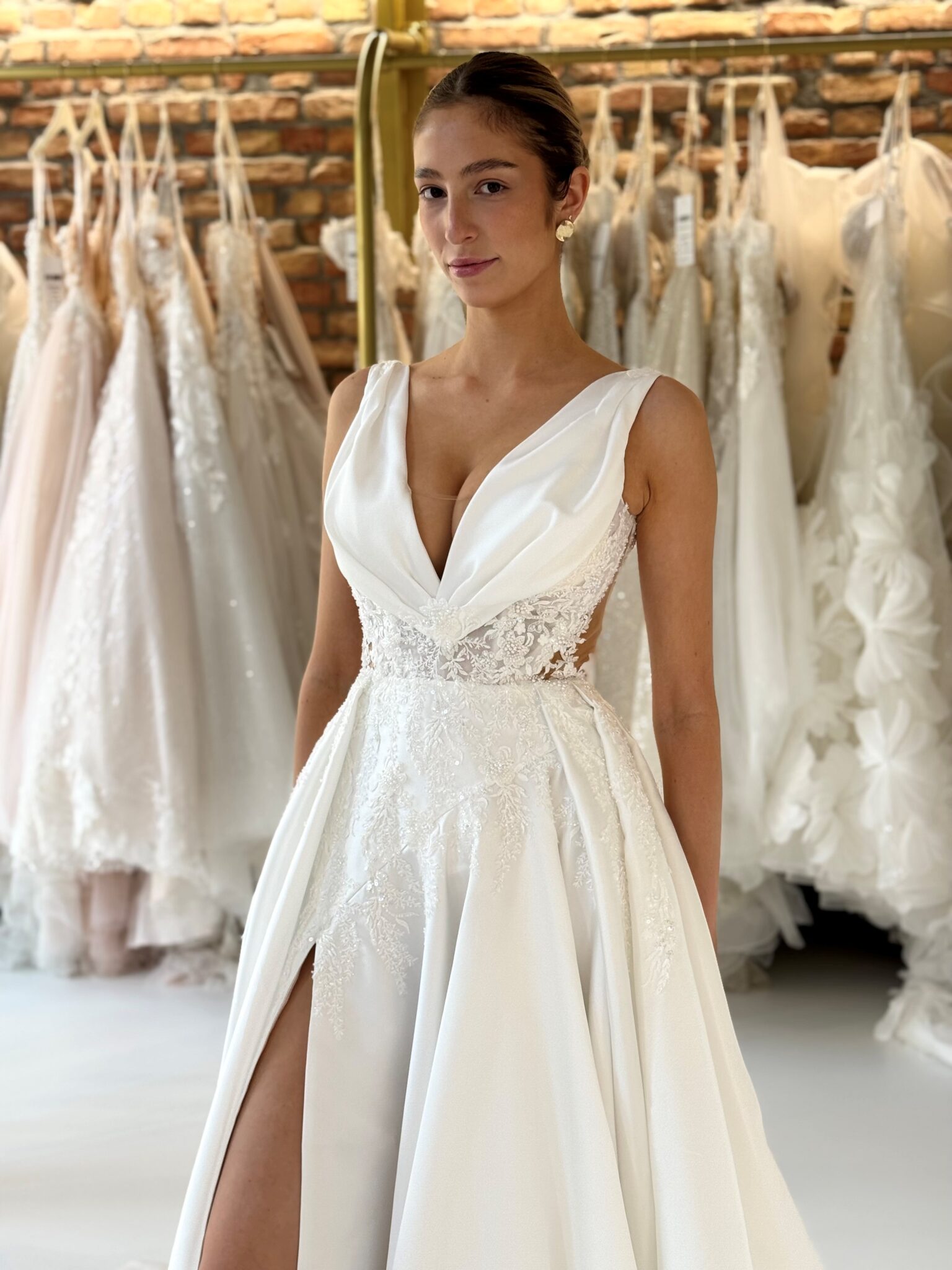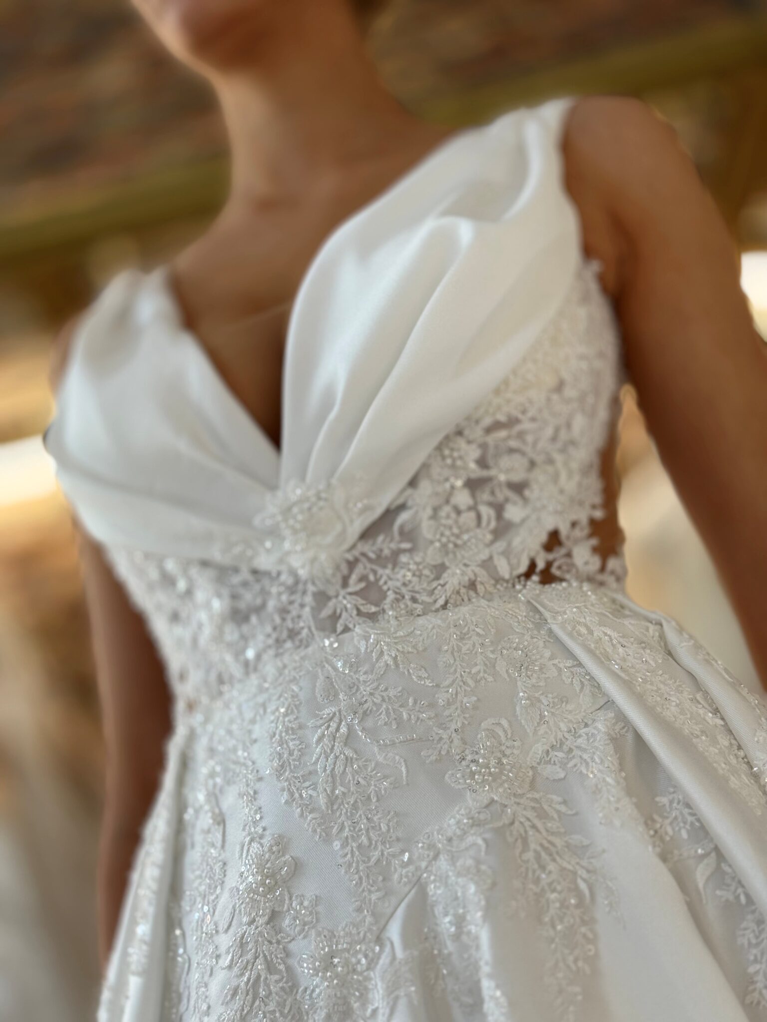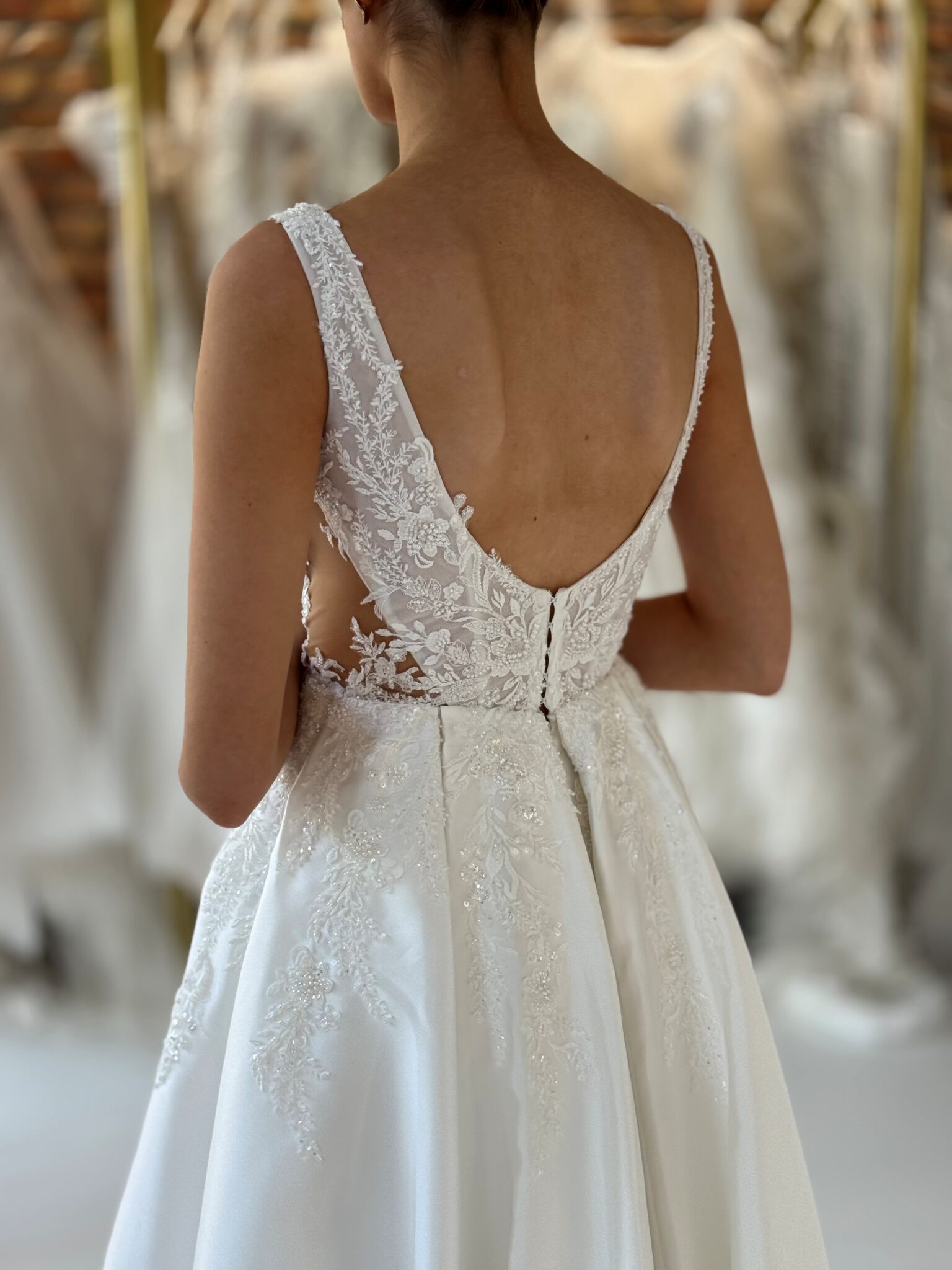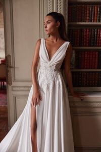 Cleane A-Linie mit tiefem V-Ausschnitt, Spitzenapplikationen in der Korsage, Cut-Outs an den Seiten und einem hohen Beinschlitz.Das Kleid in Gr. 34 passte: Unser Model ist 1,78 m, trägt Gr. 36/38 und hat Körbchengröße: 75E mit den Maßen: B: 89cm, T: 66cm, H:97cm.