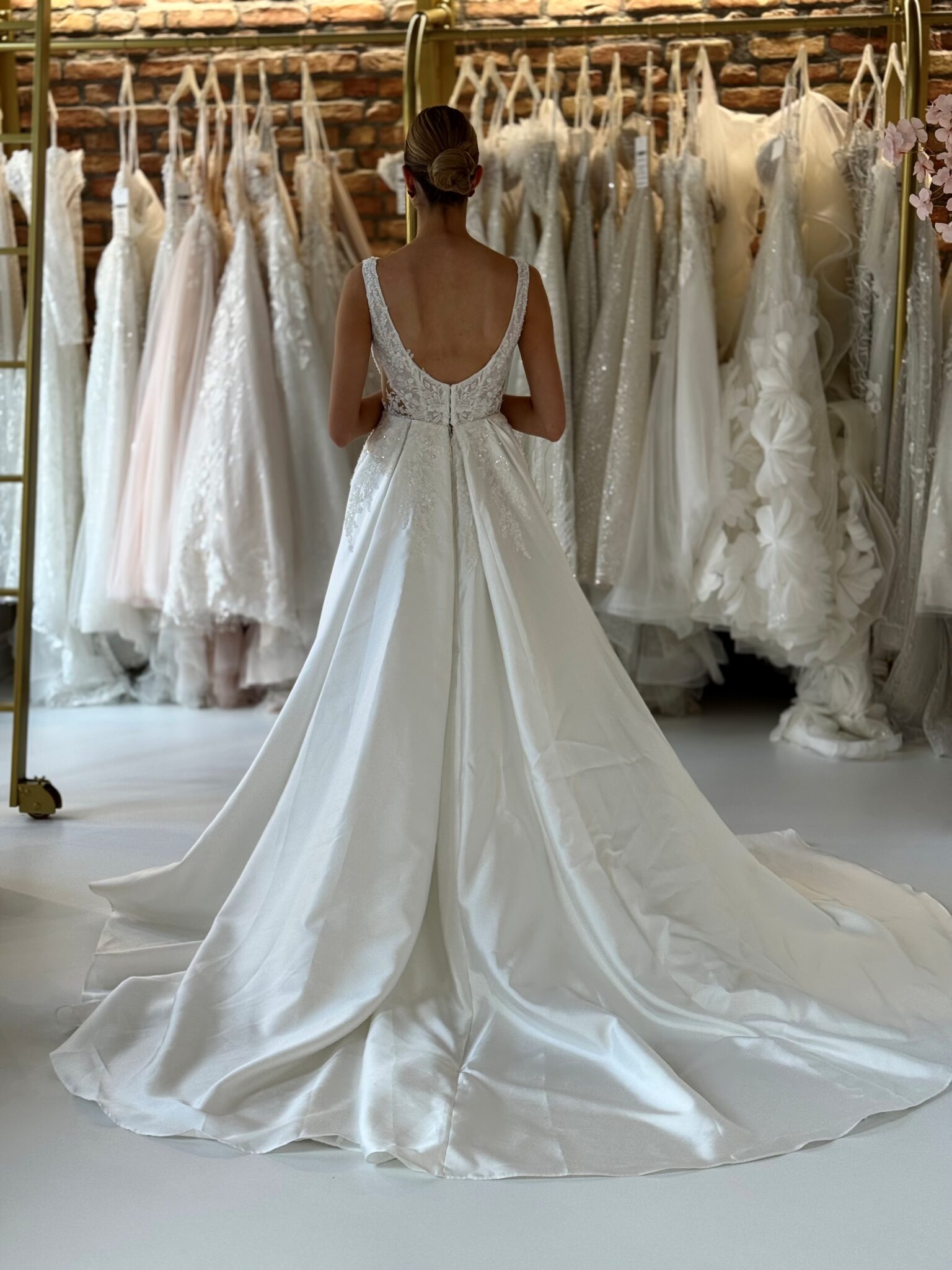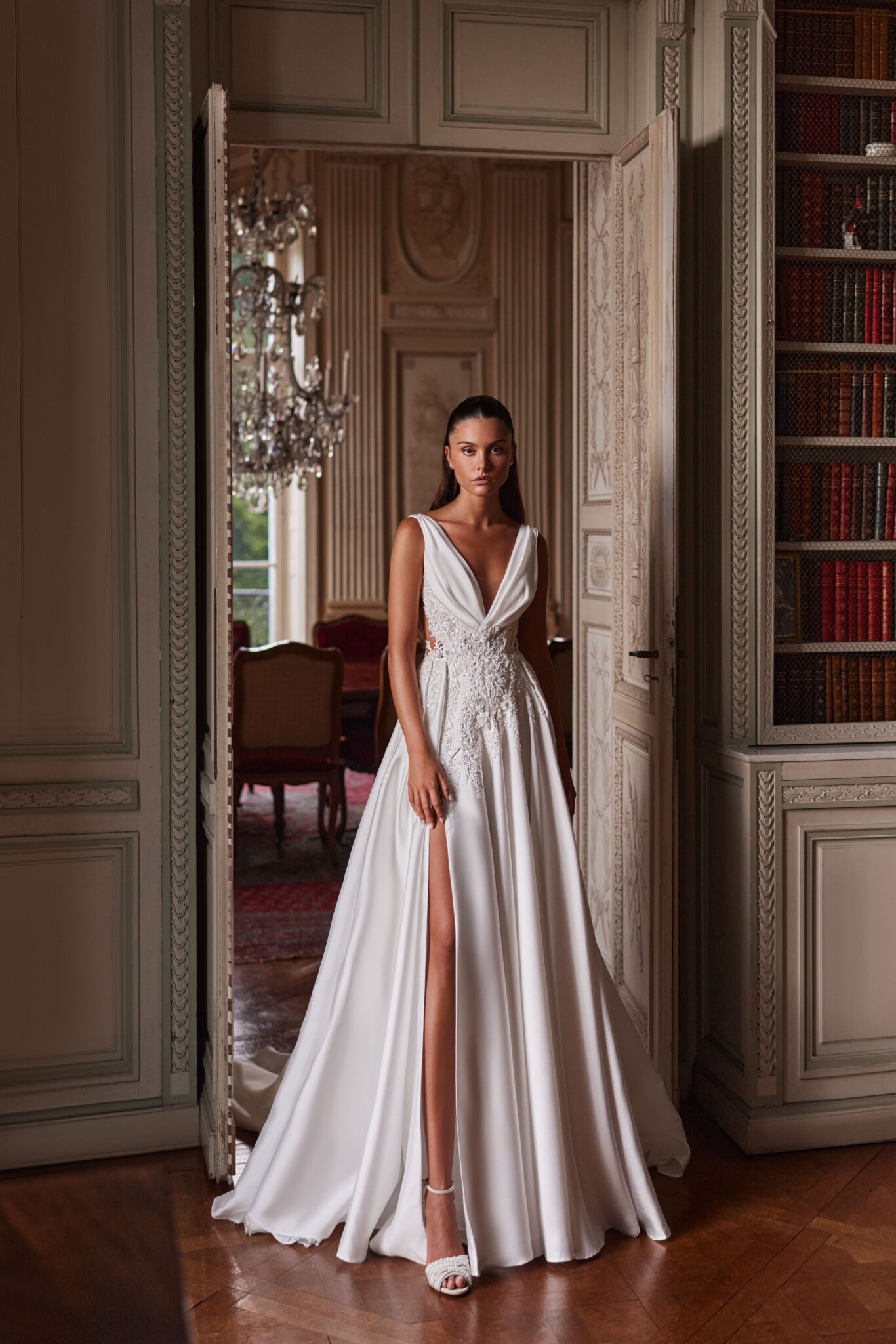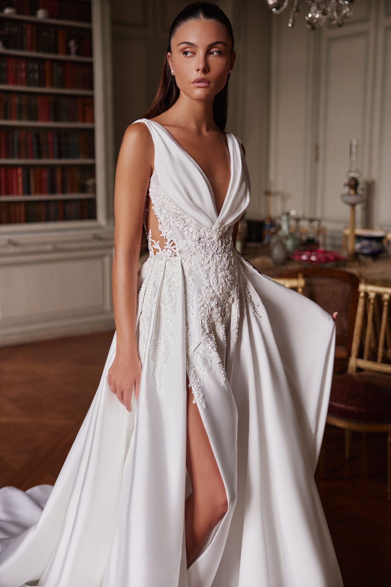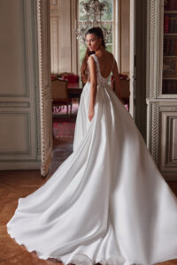Cleane A-Linie mit tiefem V-Ausschnitt, Spitzenapplikationen in der Korsage, Cut-Outs an den Seiten und einem hohen Beinschlitz.Das Kleid in Gr. 34 passte: Unser Model ist 1,78 m, trägt Gr. 36/38 und hat Körbchengröße: 75E mit den Maßen: B: 89cm, T: 66cm, H:97cm.