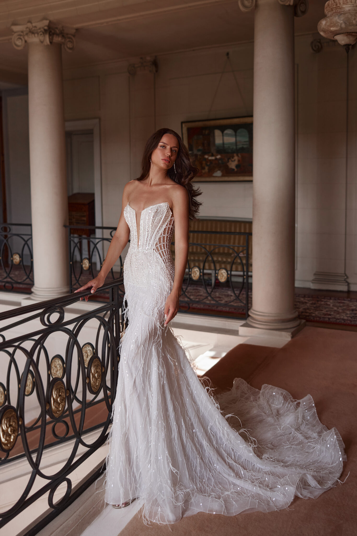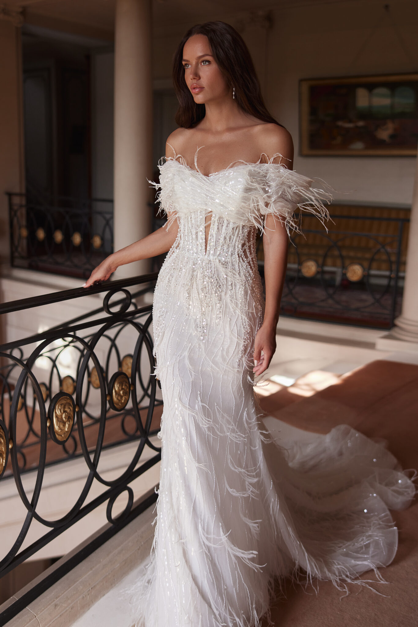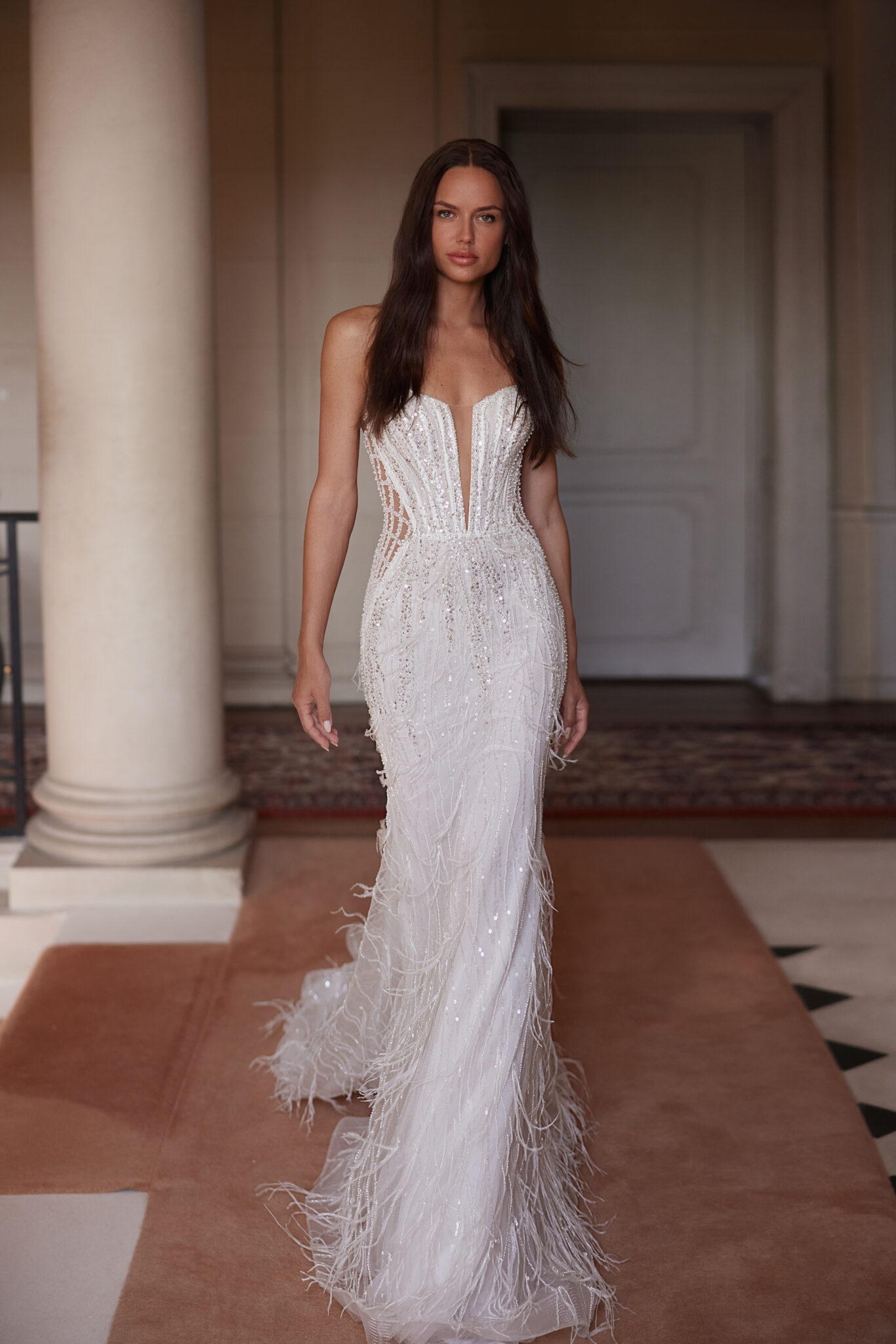 Anmutig fließendes Brautkleid mit leichter, beweglicher Struktur, die sanft jeder Bewegung folgt. Dezente Cut-outs betonen die Taille und lassen die Silhouette besonders schmal wirken, während der Stoff dem Look eine elegante, natürliche Ausstrahlung verleiht.