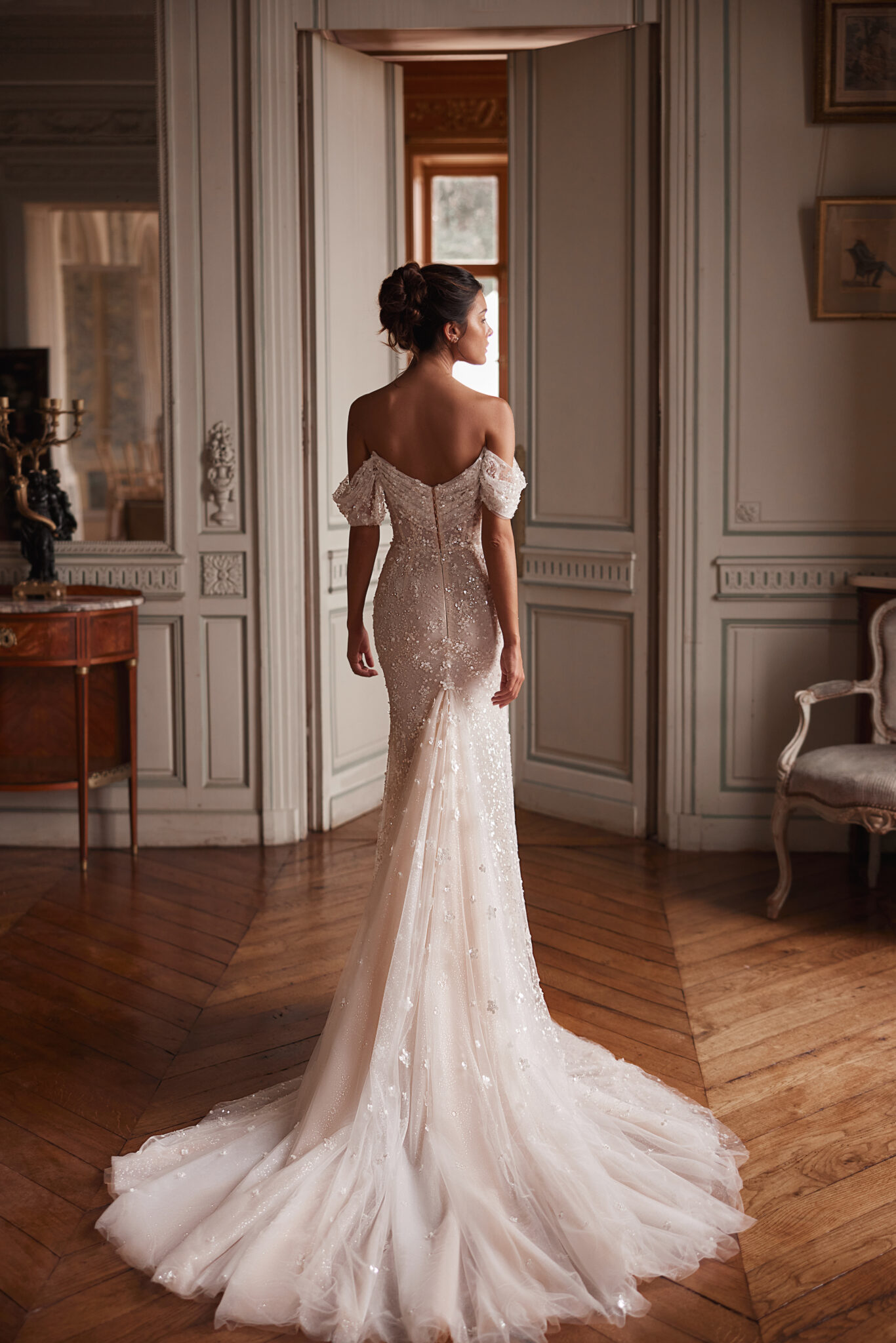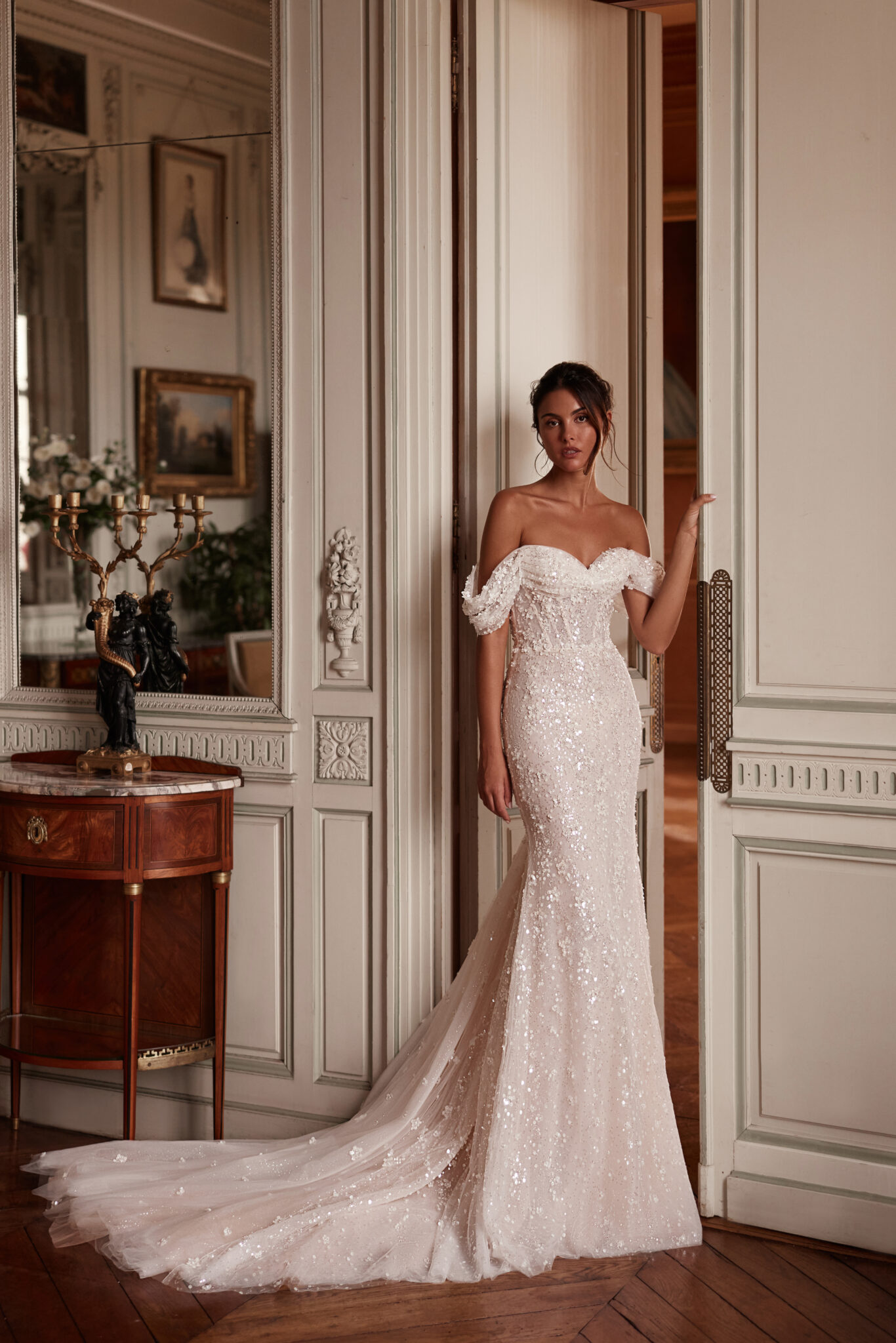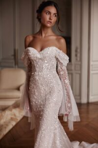 Dieses mit Pailletten bestickte Kleid strahlt pure Zartheit aus und verleiht ihm ein besonders lebendiges Schimmern. Abgerundet wird der Look durch weiche Falten an den Schultern und einen sanft gerafften Saum.