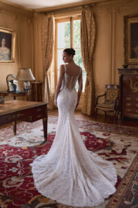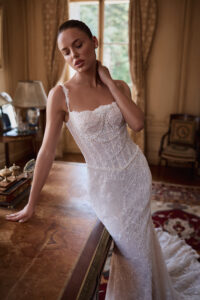 Verführerisches Brautkleid im Meerjungfrauenstil mit figurbetonter Silhouette und zarter Perlenverzierung. Feine Spitze am Ausschnitt setzt ein besonderes Detail und rundet den Look elegant ab.