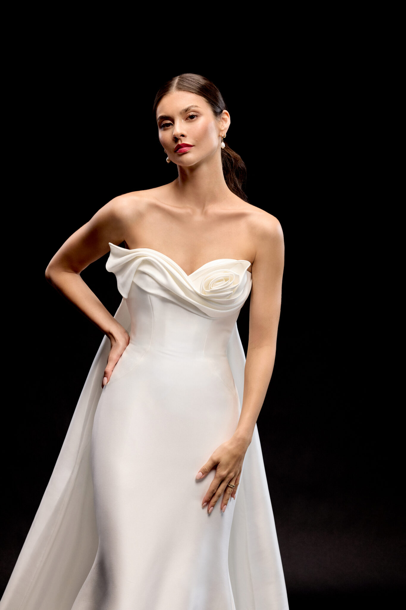 Cleanes fit and flare von Justin Alexander - YUE mit Blumenraffung in der Korsage und einem Herzausschnitt. Das Kleid in Gr. 34 passte gut: Unser Model ist 1,78 m, trägt Gr. 36/38 und hat Körbchengröße: 75E mit den Maßen: B: 89cm, T: 66cm, H:97cm.