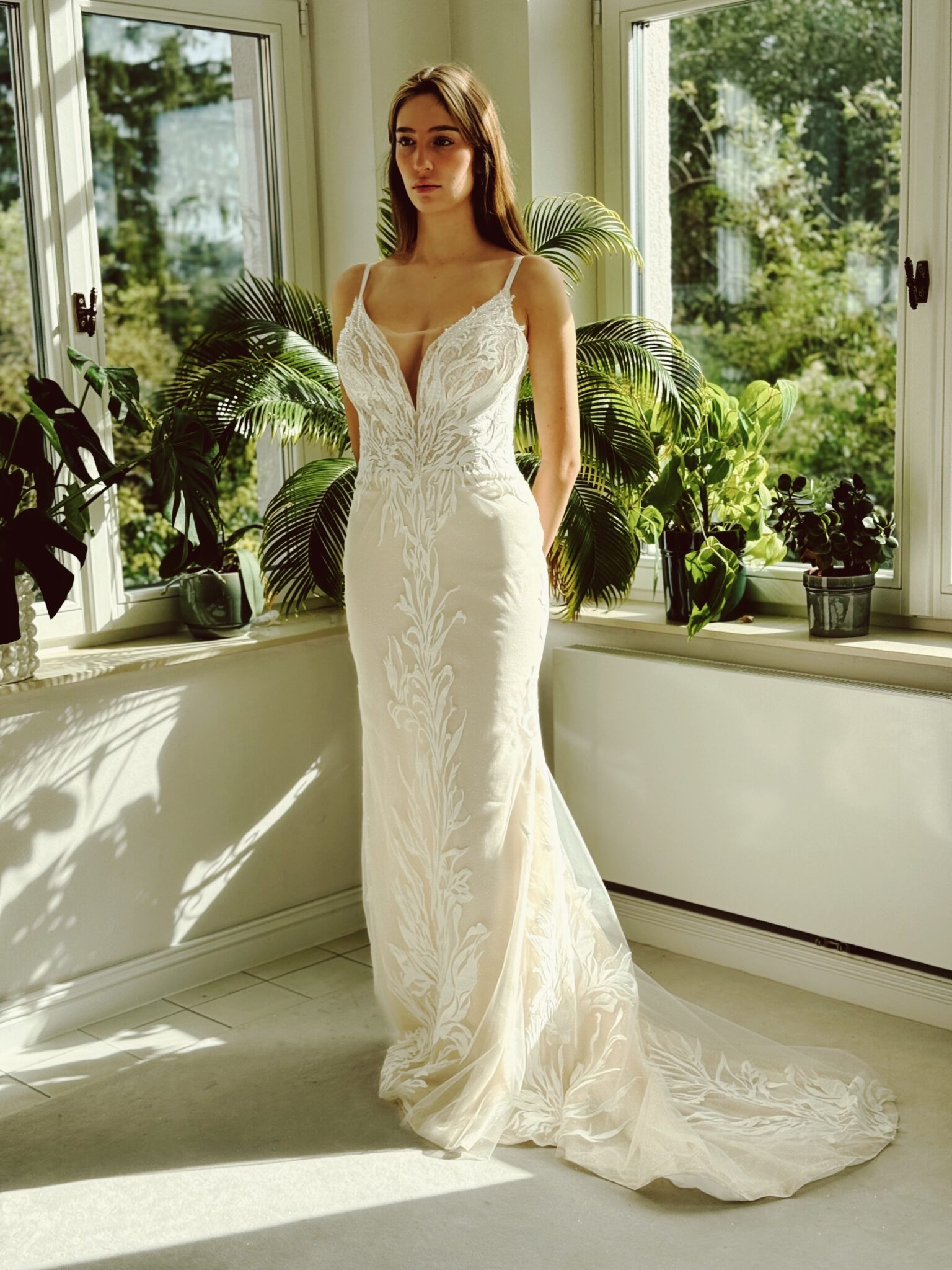 Fit & Flare-Brautkleid mit Glitzertüll im Rock, figurschmeichelnden Applikationen & Spaghetti-Trägern. Die Gr. 44 wurde entsprechend abgesteckt: Unser Model ist 1,78 m, trägt Gr. 36/38 und hat Körbchengröße: 75E mit den Maßen: B: 89cm, T: 66cm, H:97cm.
