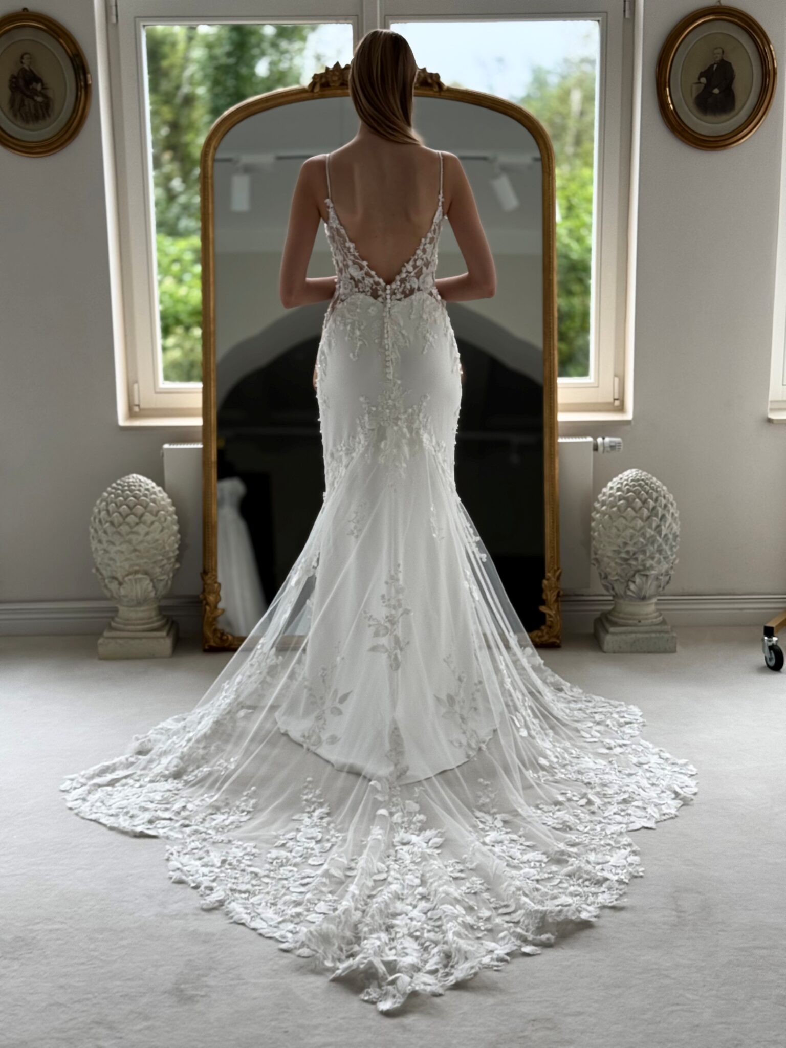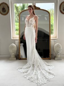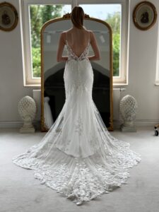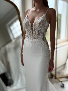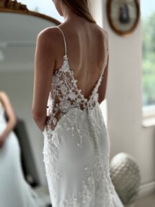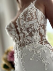 Fit and flare mit cleanem Rock, Glitzer-Spitzenapplikationen in der Korsage und Cut Outs an den Seiten. Das Kleid in Gr. 38 passte. Unser Model ist 1,78 m, trägt Gr. 36/38 und hat Körbchengröße: 75E mit den Maßen: B: 89cm, T: 66cm, H:97cm.